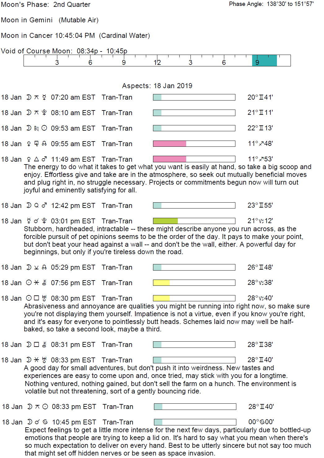 Planet Color Key: The longer the bar, the slower the aspecting planet and the longer the duration of the planet’s transit.