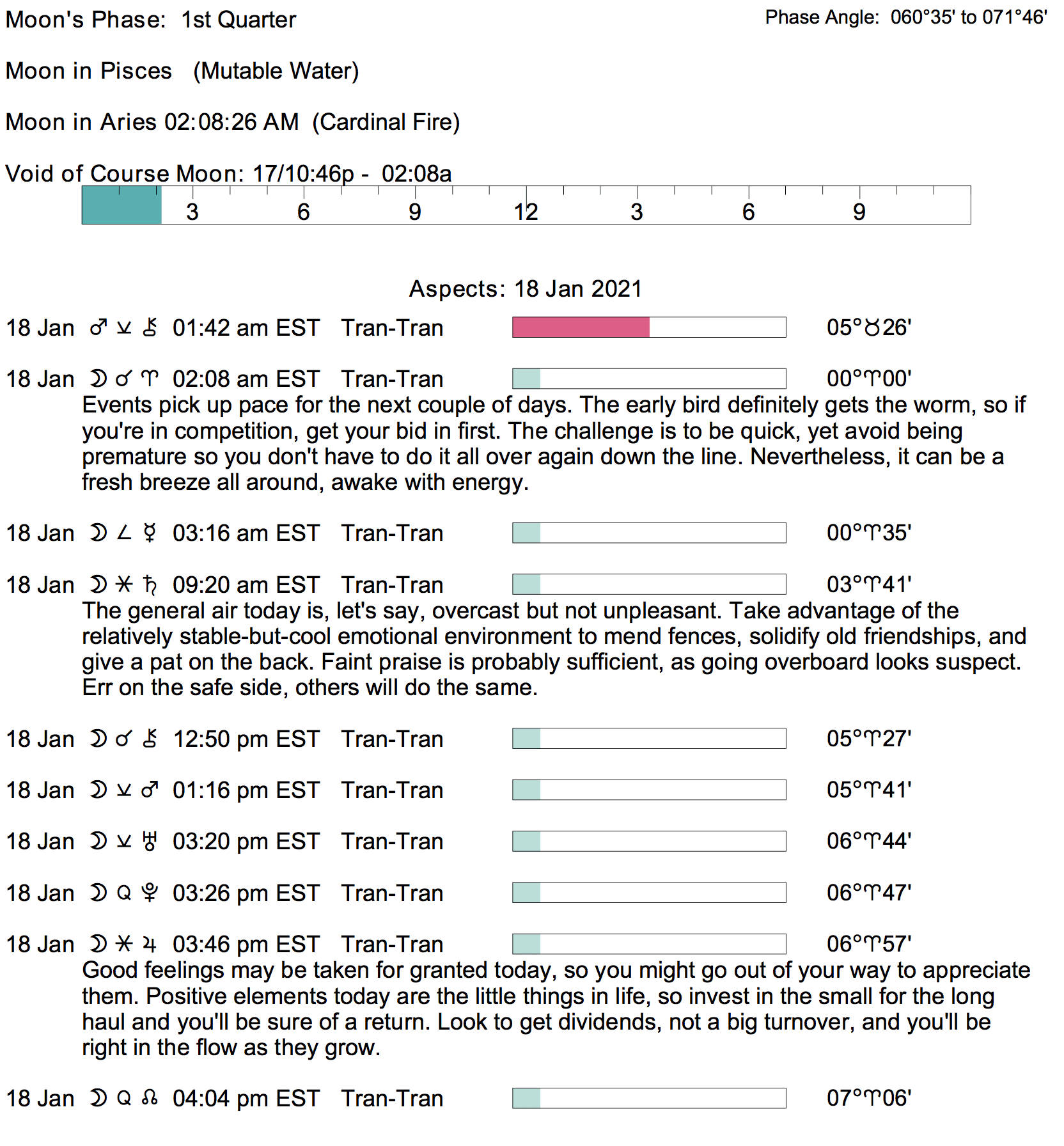 Planet Color Key: The longer the bar, the slower the aspecting planet, and the longer the duration of the planet’s transit.
