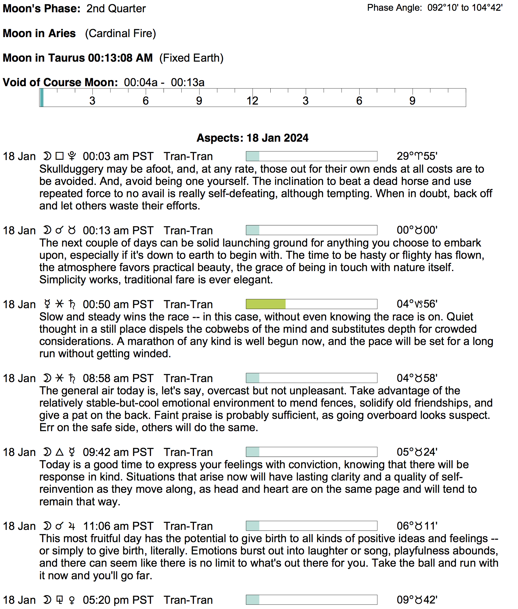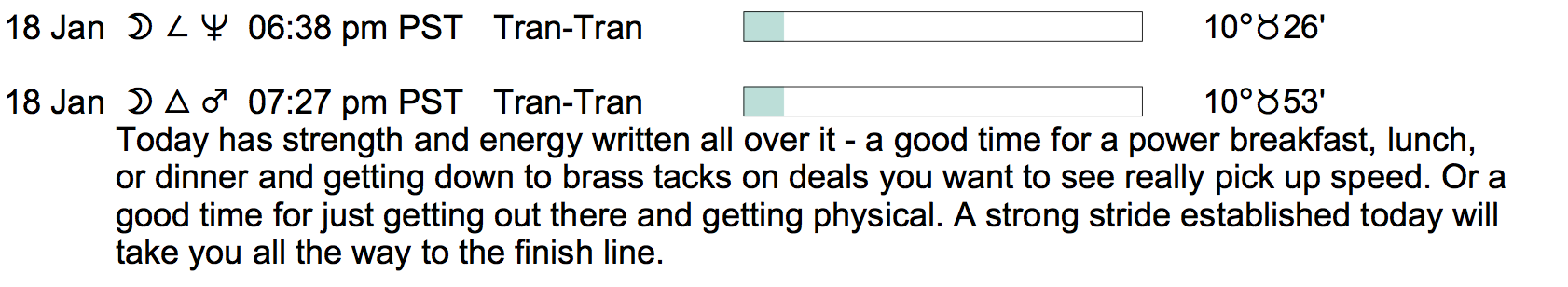 Planet Color Key: The longer the bar, the slower the aspecting planet, and the longer the duration of the planet’s transit.