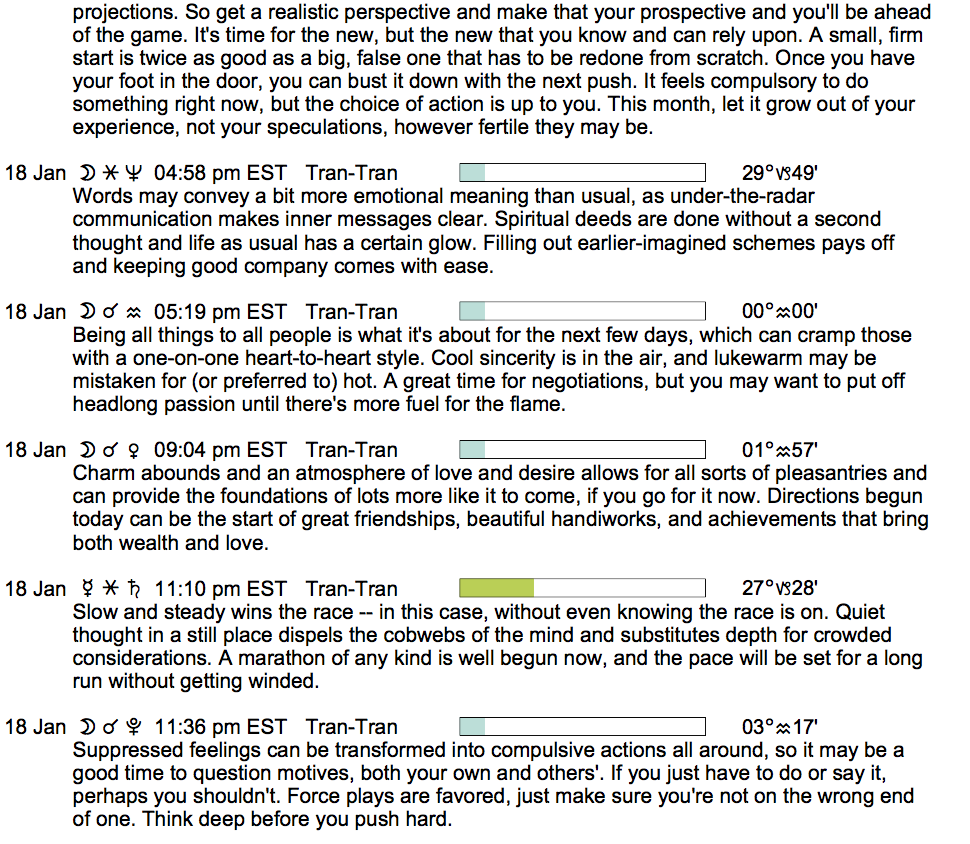 Planet Color Key: The longer the bar, the slower the aspecting planet, and the longer the duration of the planet’s transit.