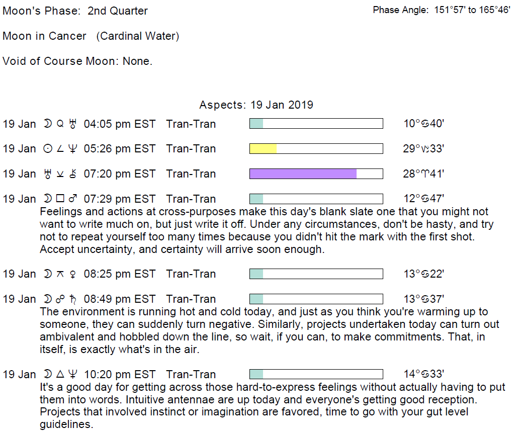 Planet Color Key: The longer the bar, the slower the aspecting planet and the longer the duration of the planet’s transit.