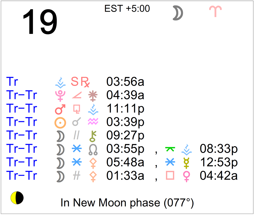 Planet Color Key: The longer the bar, the slower the aspecting planet, and the longer the duration of the planet’s transit.