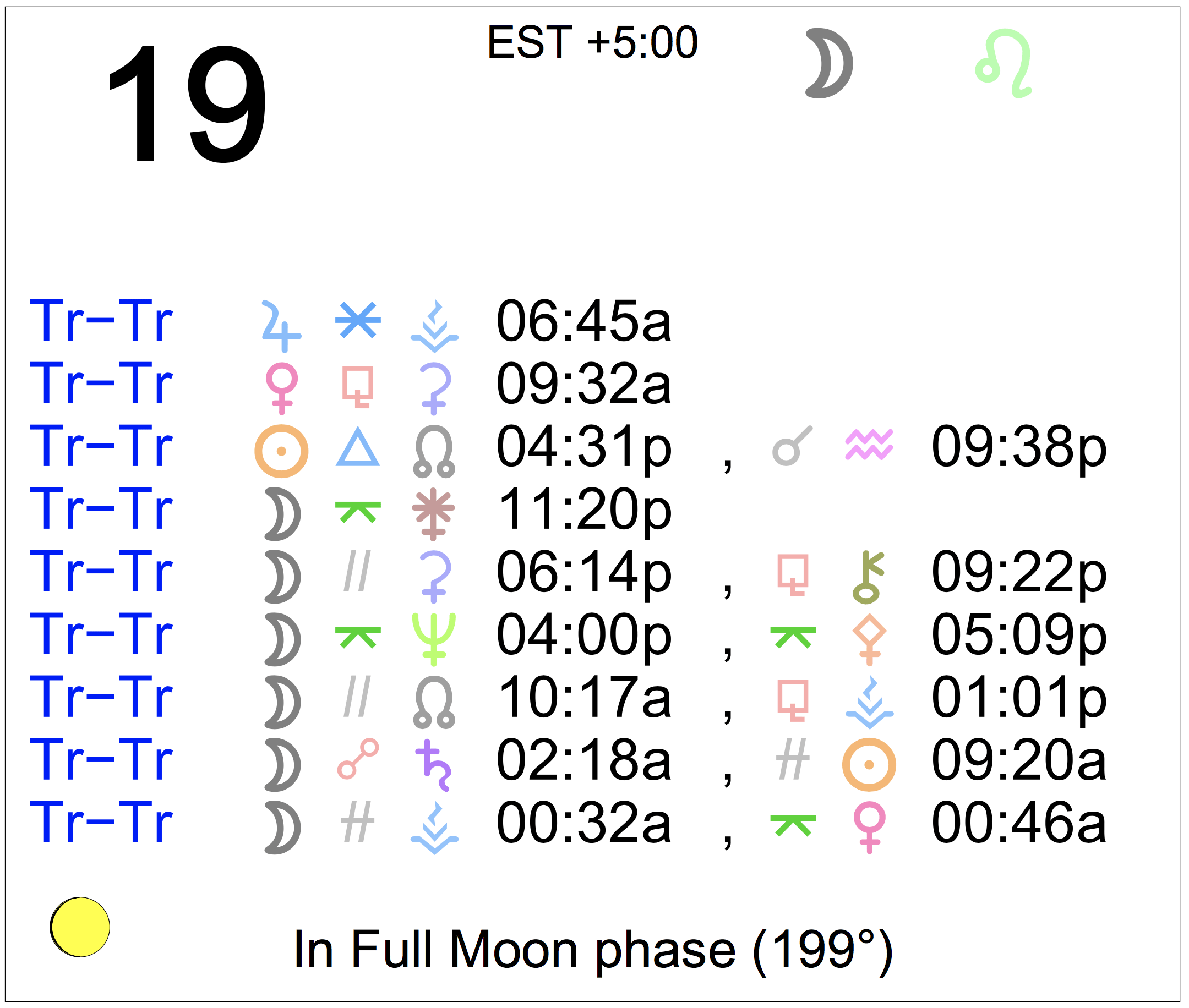 Planet Color Key: The longer the bar, the slower the aspecting planet, and the longer the duration of the planet’s transit.
