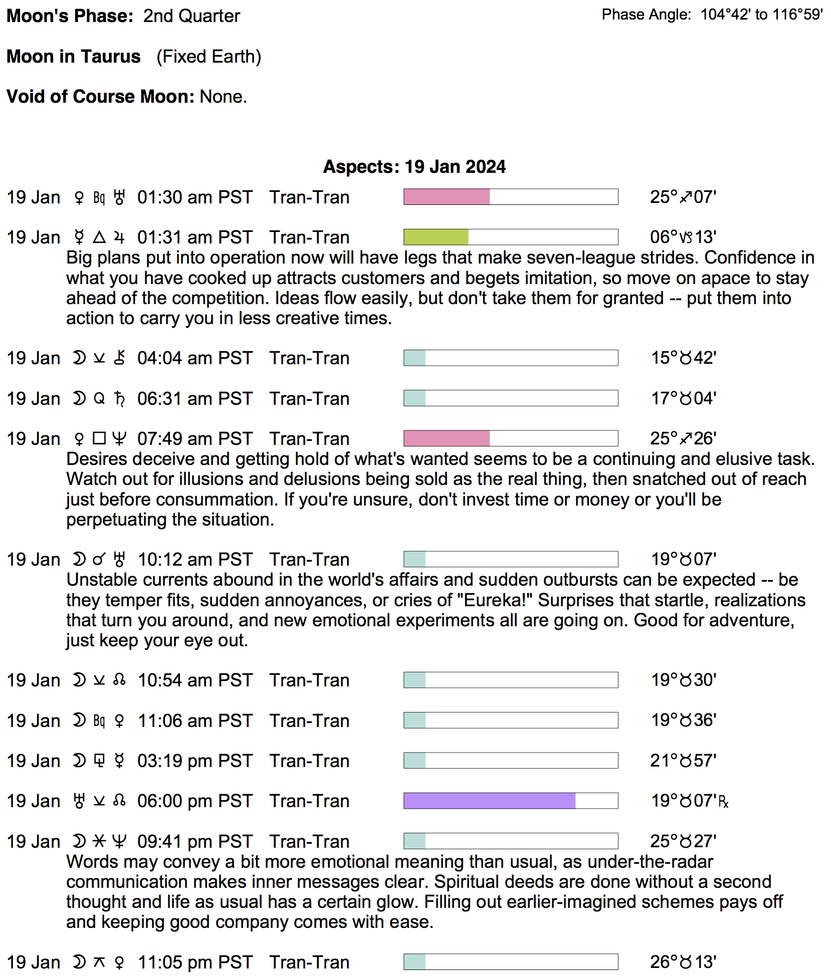 Planet Color Key: The longer the bar, the slower the aspecting planet, and the longer the duration of the planet’s transit.