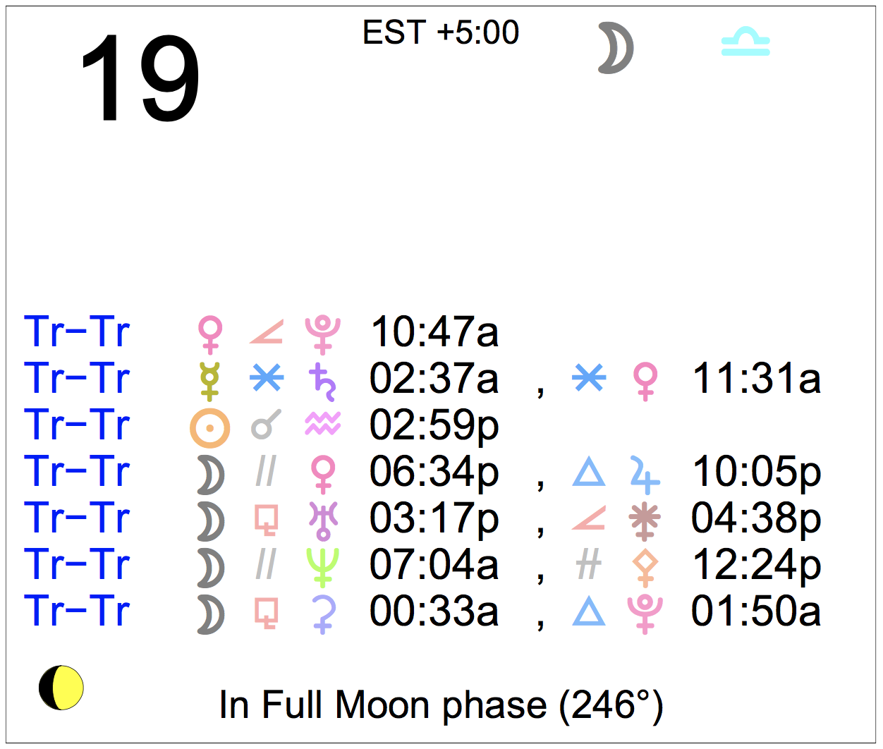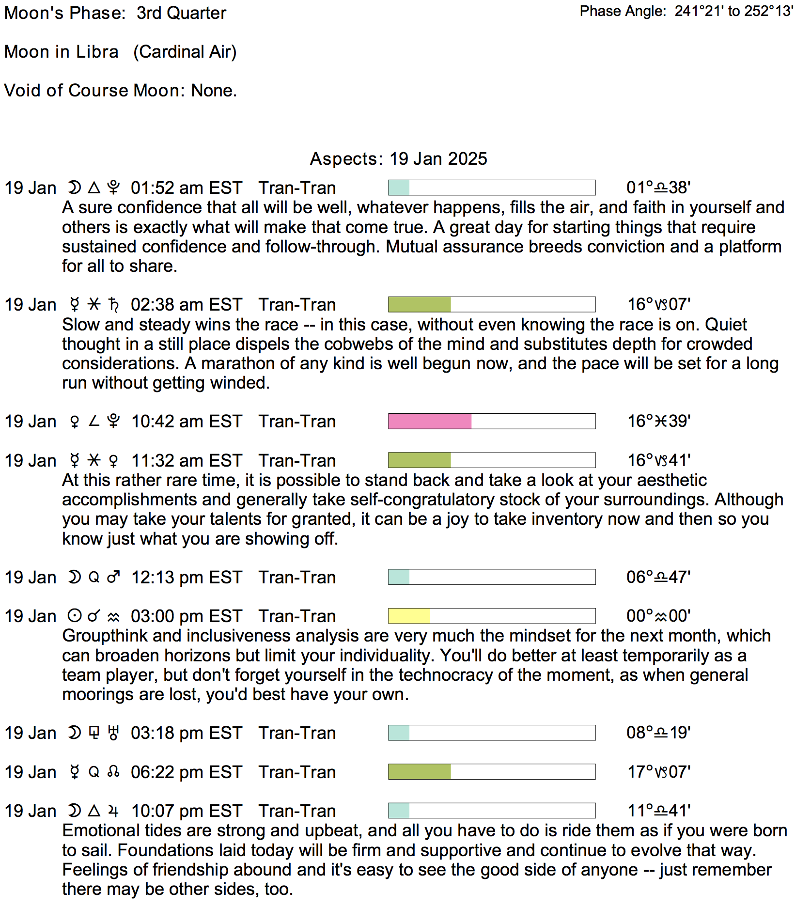 Planet Color Key: The longer the bar, the slower the aspecting planet, and the longer the duration of the planet’s transit.