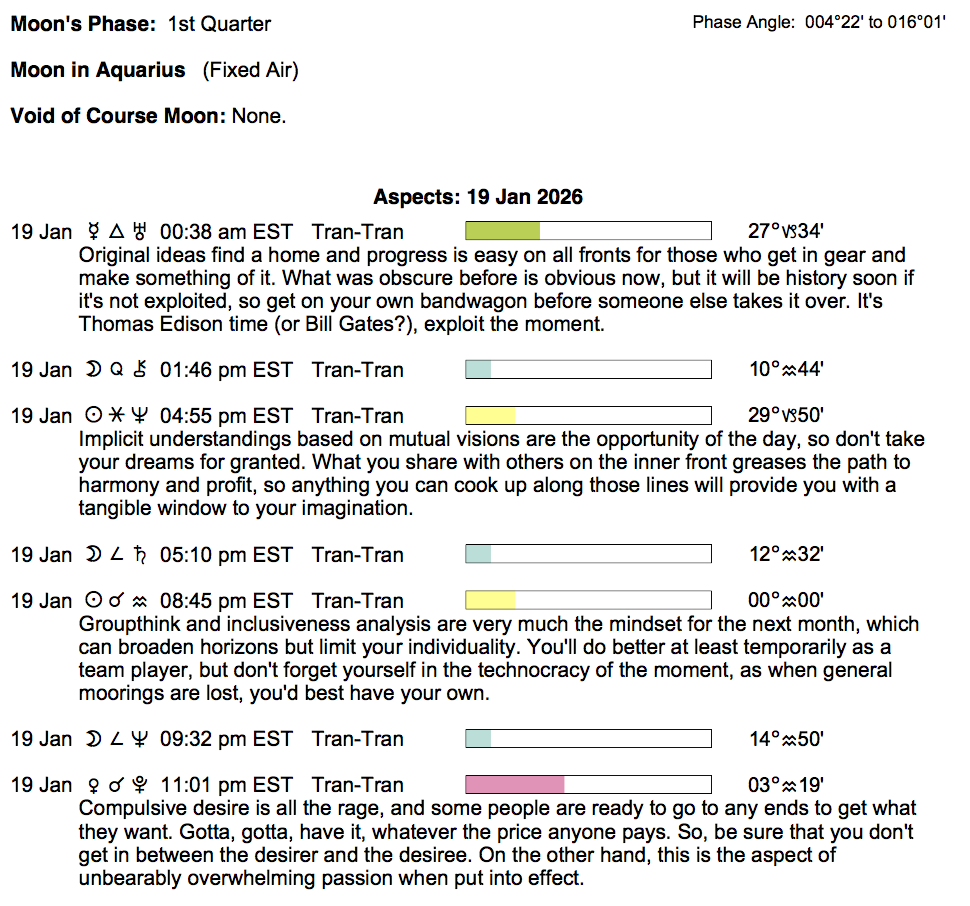 Planet Color Key: The longer the bar, the slower the aspecting planet, and the longer the duration of the planet’s transit.