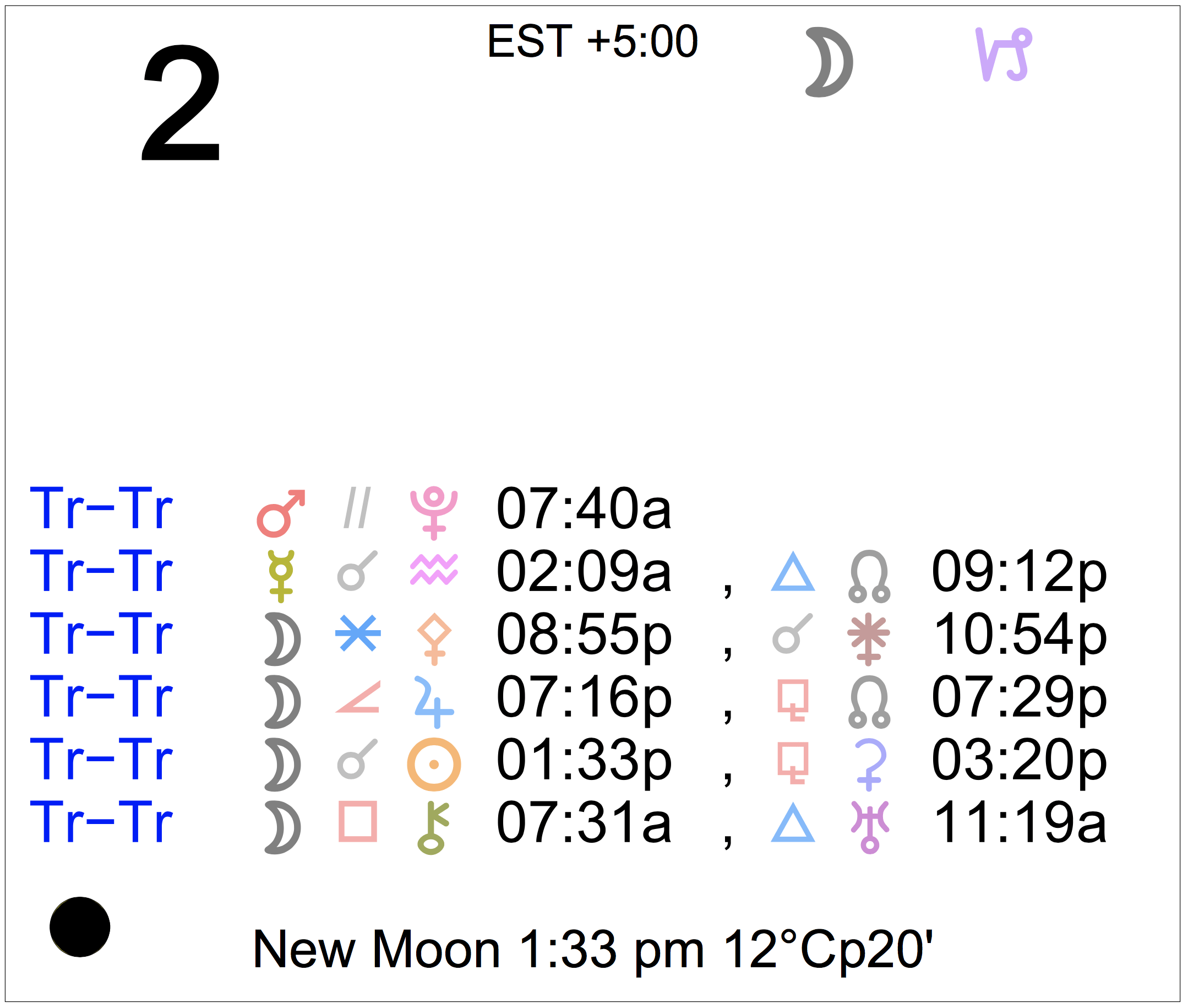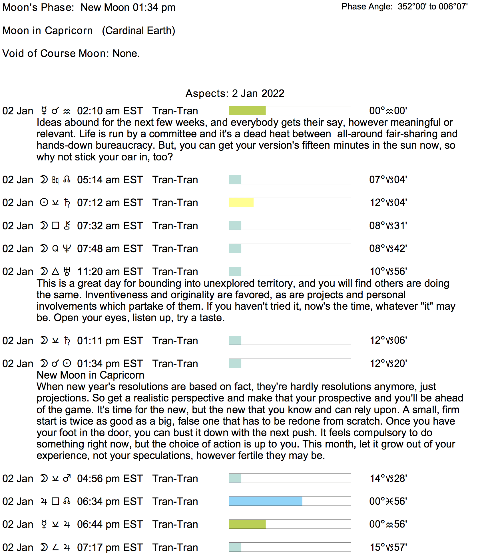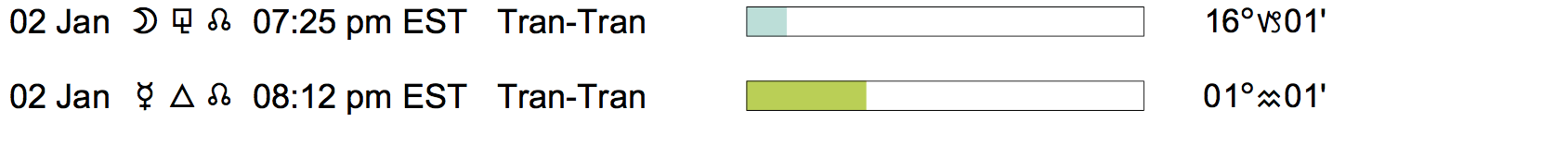 Planet Color Key: The longer the bar, the slower the aspecting planet, and the longer the duration of the planet’s transit.