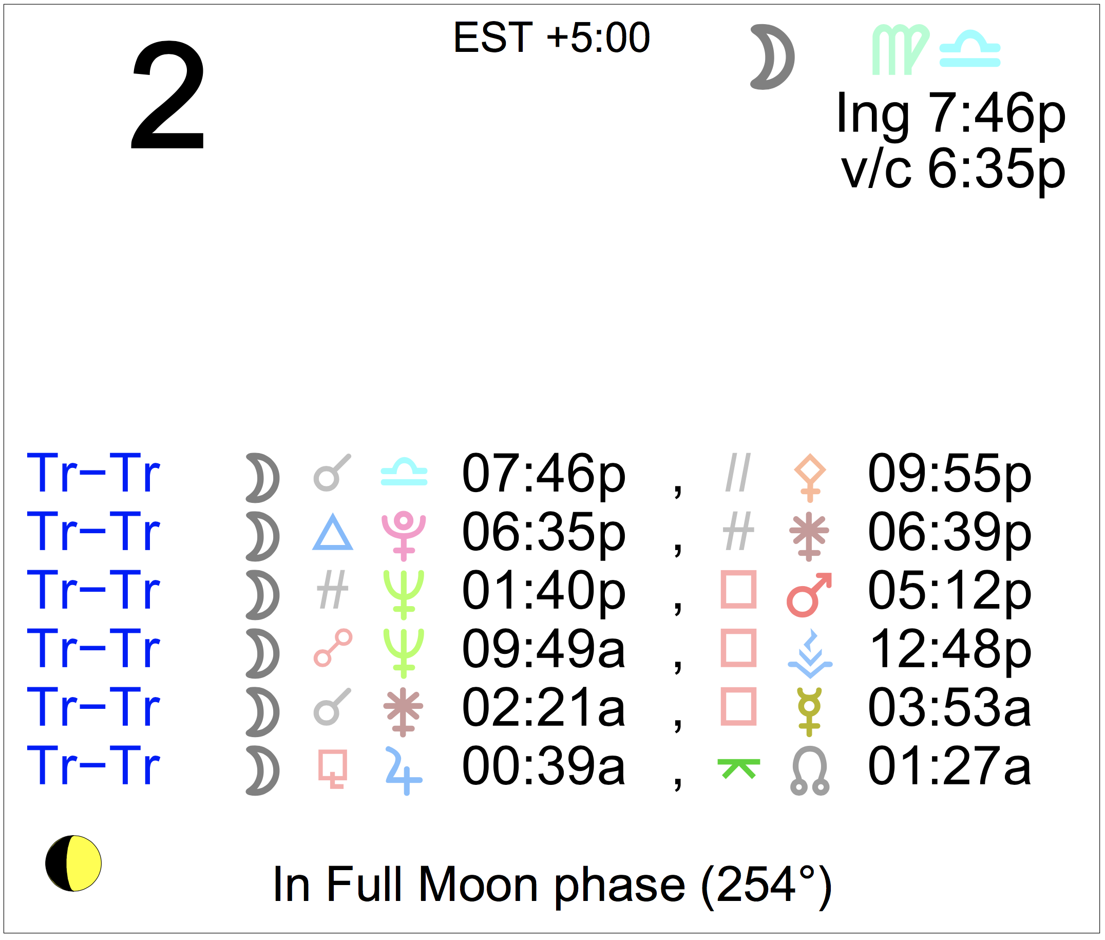 Planet Color Key: The longer the bar, the slower the aspecting planet, and the longer the duration of the planet’s transit.