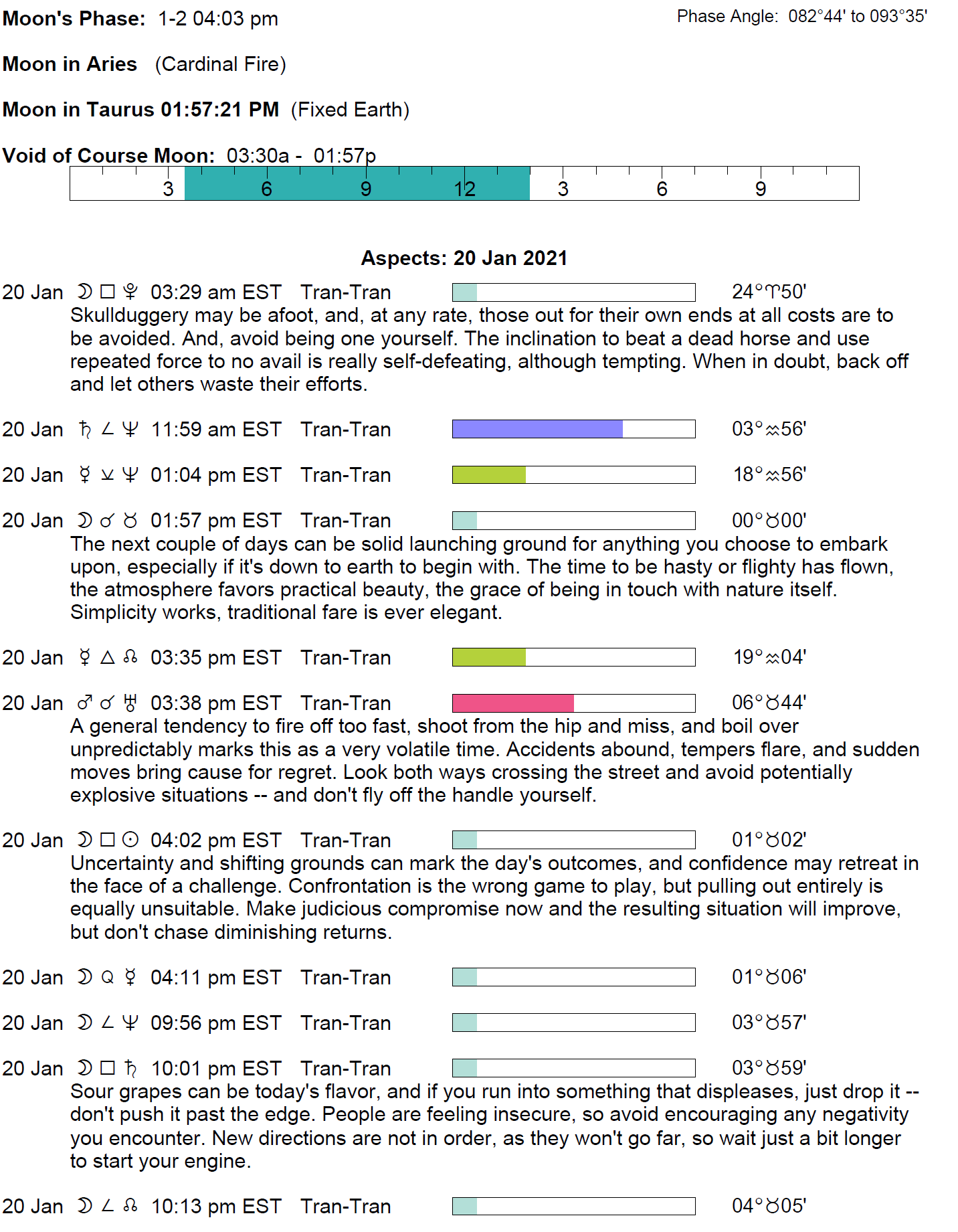 Planet Color Key: The longer the bar, the slower the aspecting planet, and the longer the duration of the planet’s transit.