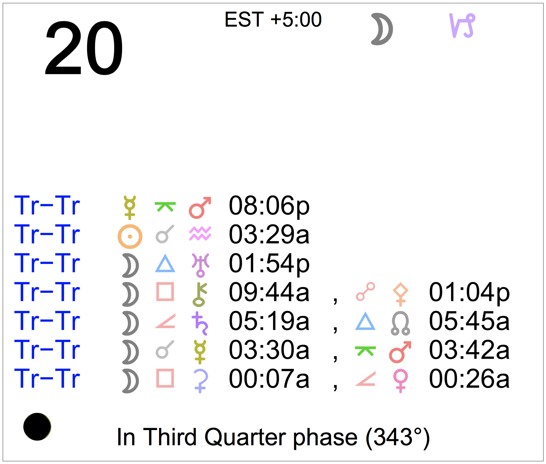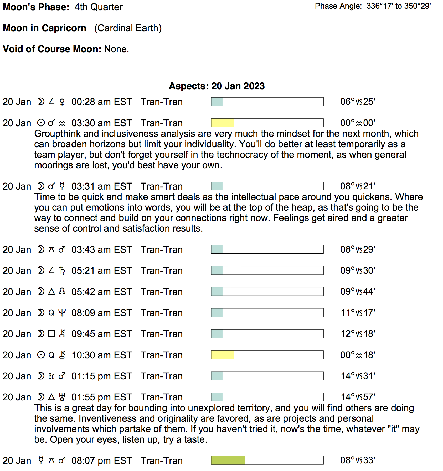 Planet Color Key: The longer the bar, the slower the aspecting planet, and the longer the duration of the planet’s transit.