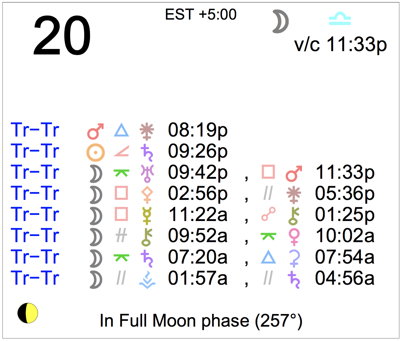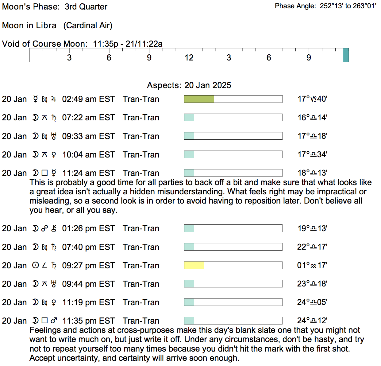 Planet Color Key: The longer the bar, the slower the aspecting planet, and the longer the duration of the planet’s transit.