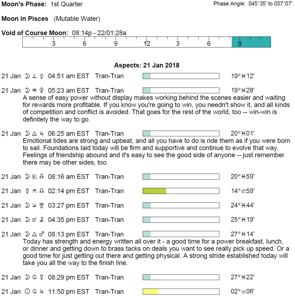 The following aspects (major only) and positions are at noon (EST) on January 21st: