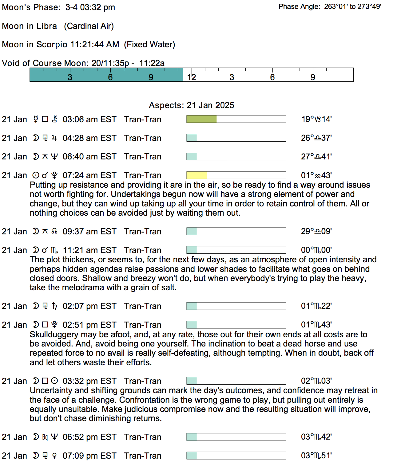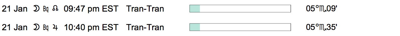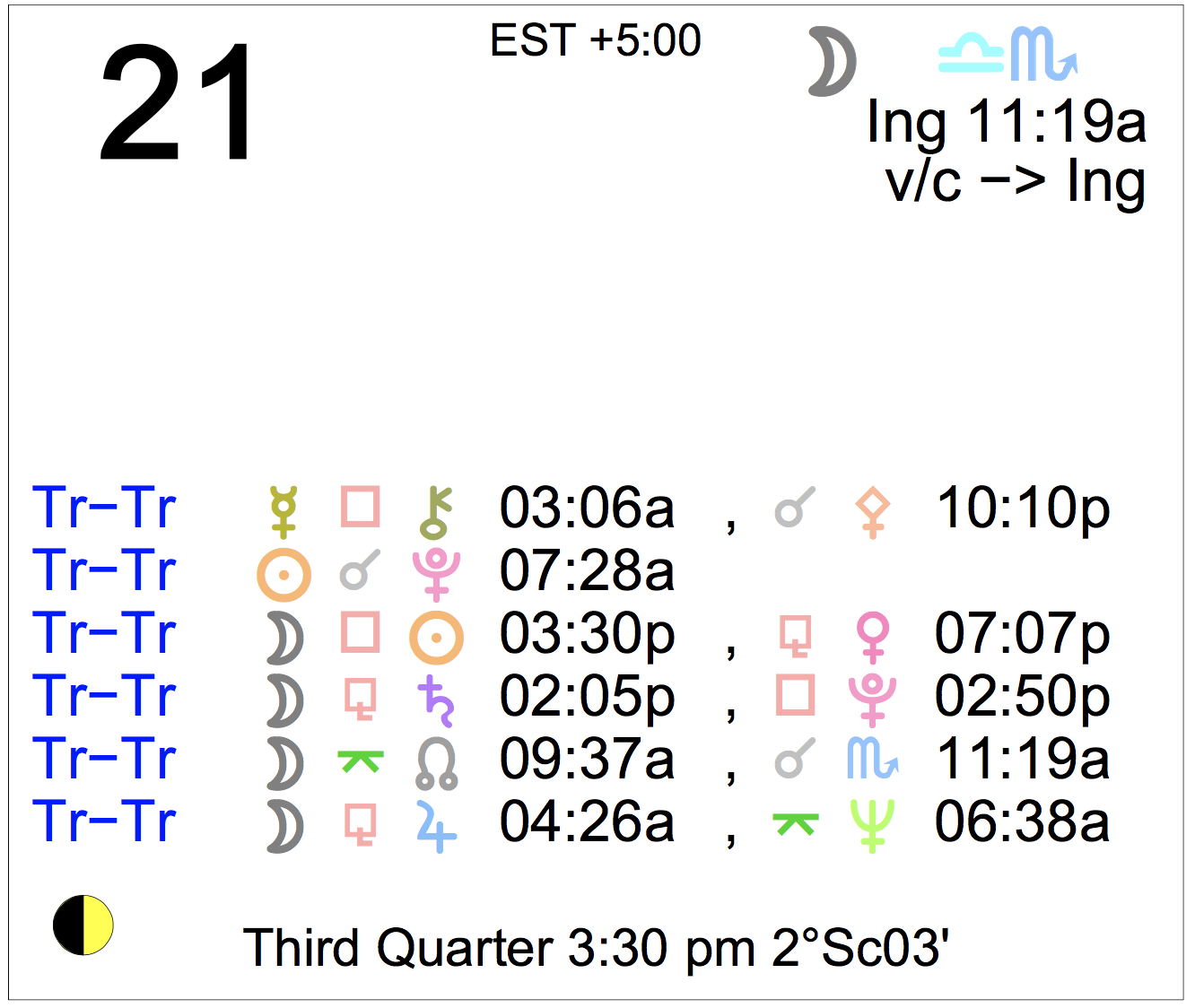 Planet Color Key: The longer the bar, the slower the aspecting planet, and the longer the duration of the planet’s transit.