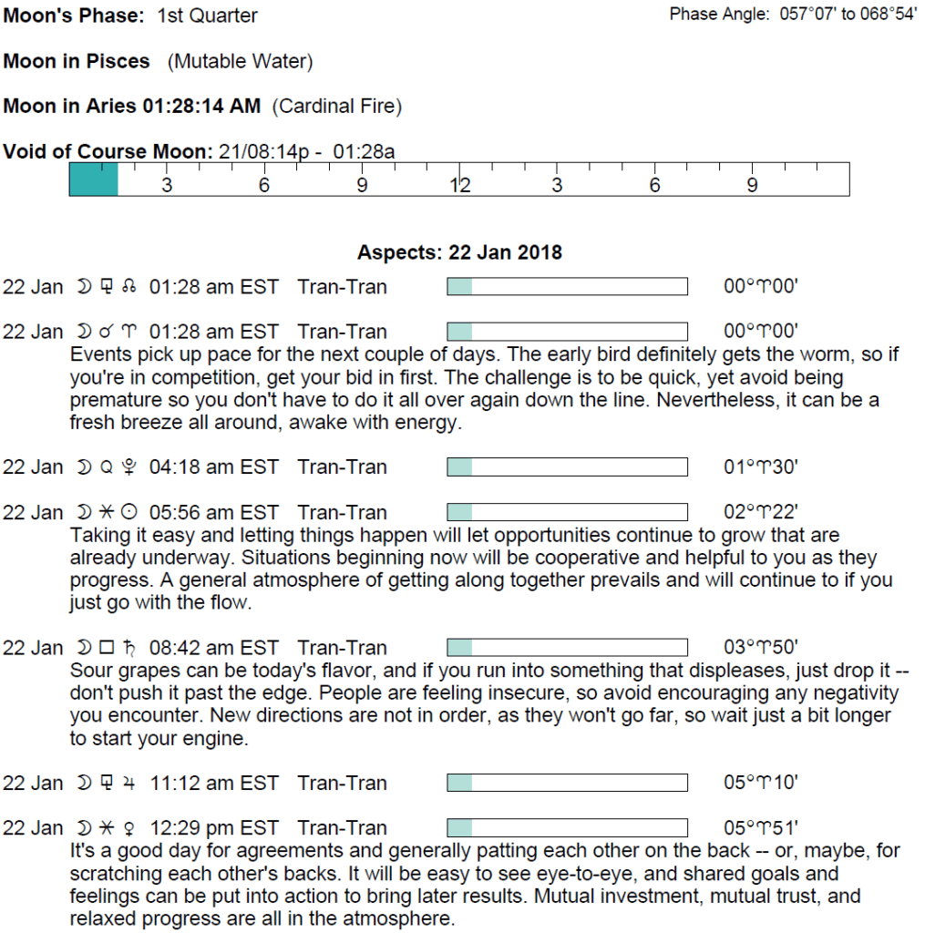 The following aspects (major only) and positions are at noon (EST) on January 22nd: