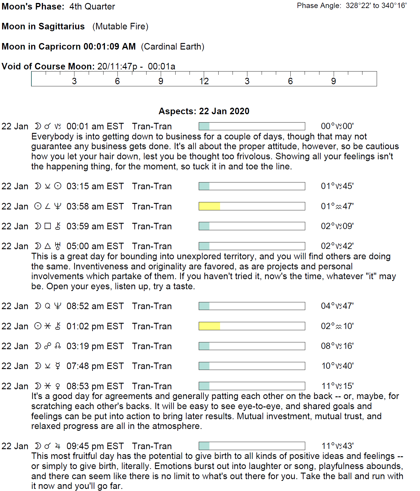 Planet Color Key: The longer the bar, the slower the aspecting planet and the longer the duration of the planet’s transit.