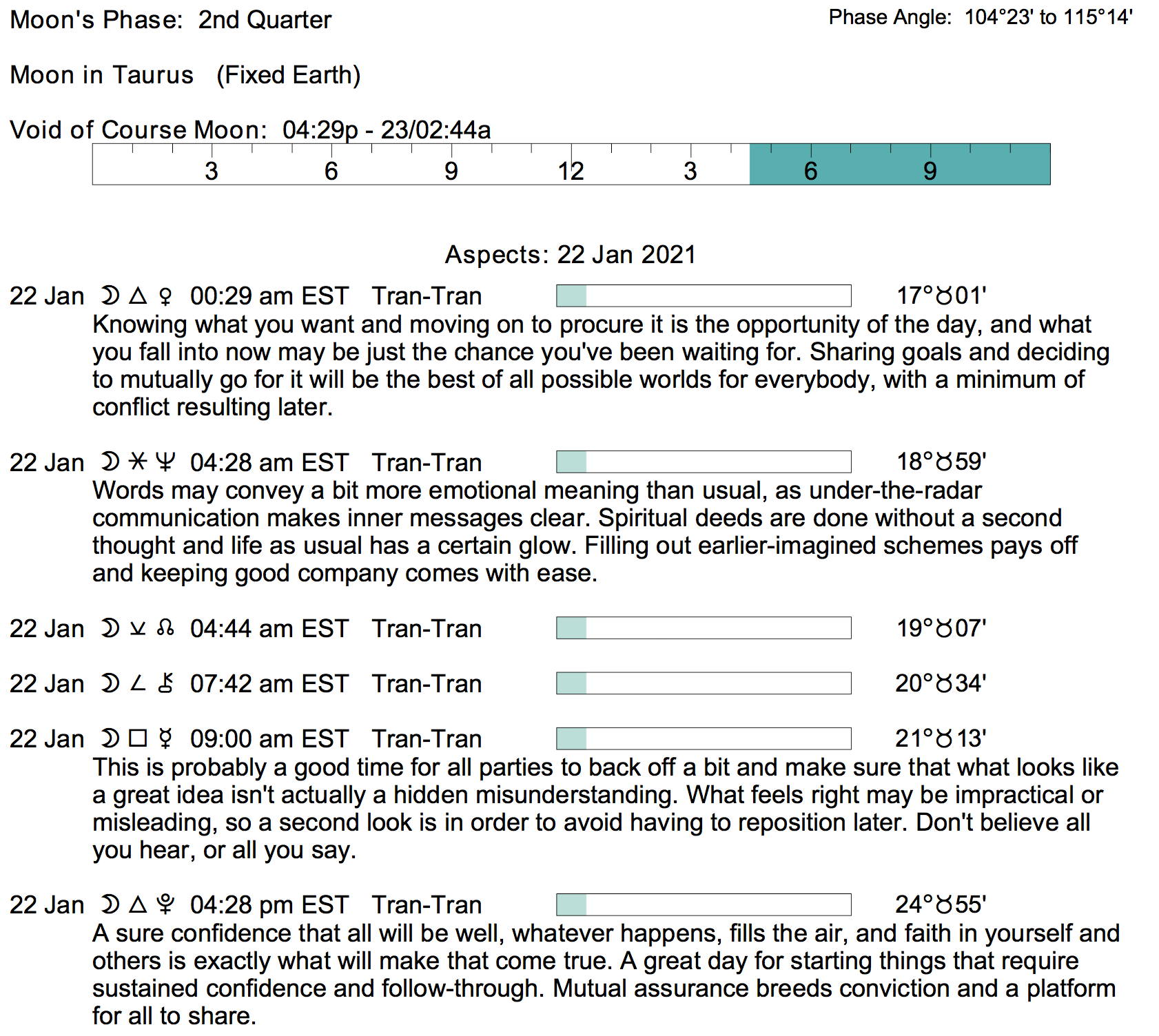 Planet Color Key: The longer the bar, the slower the aspecting planet, and the longer the duration of the planet’s transit.