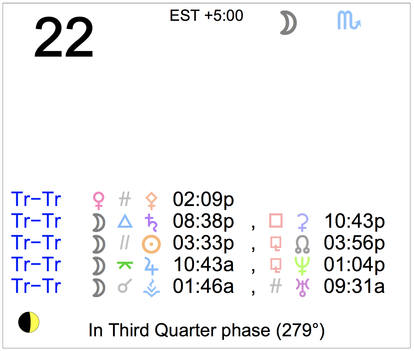 Planet Color Key: The longer the bar, the slower the aspecting planet, and the longer the duration of the planet’s transit.