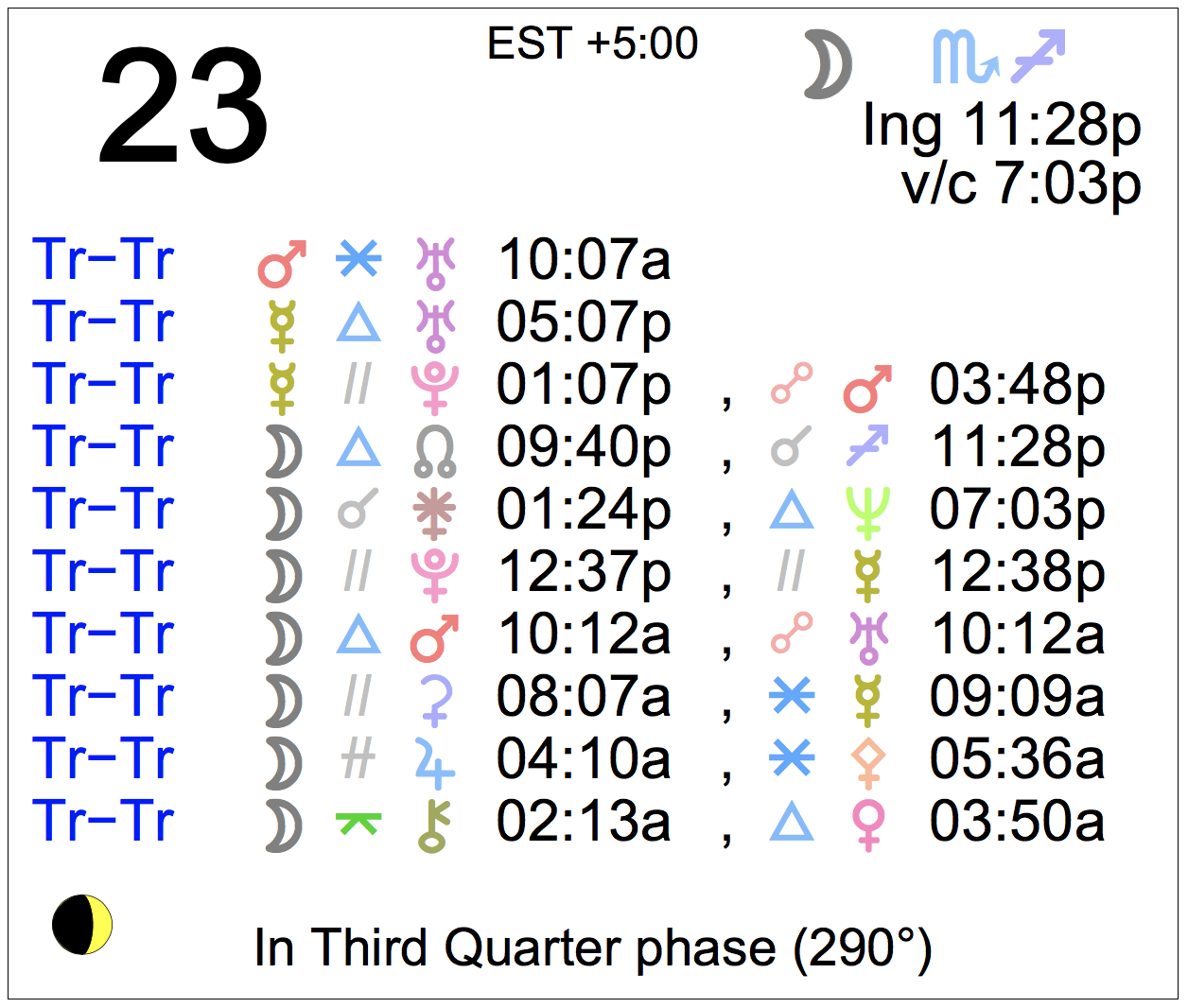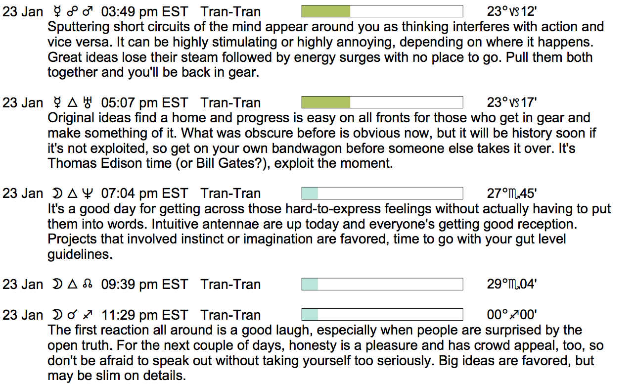 Planet Color Key: The longer the bar, the slower the aspecting planet, and the longer the duration of the planet’s transit.