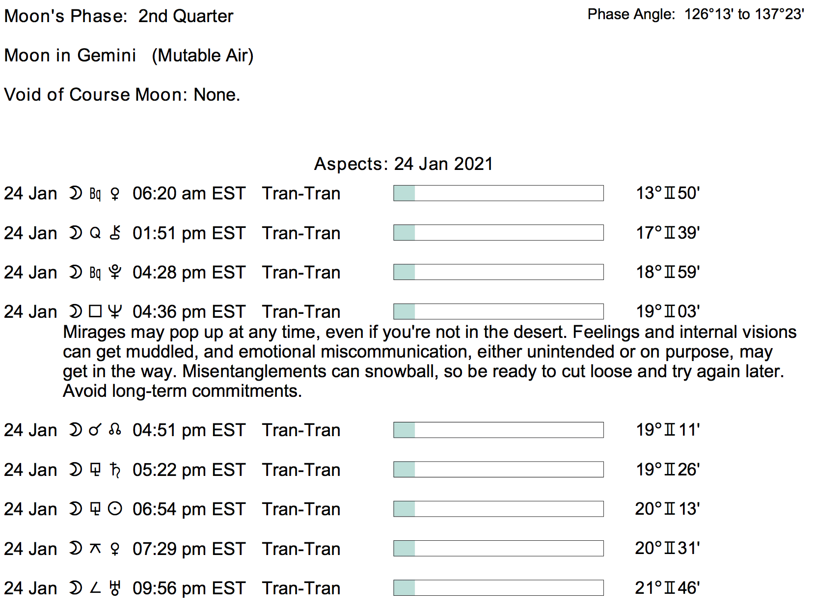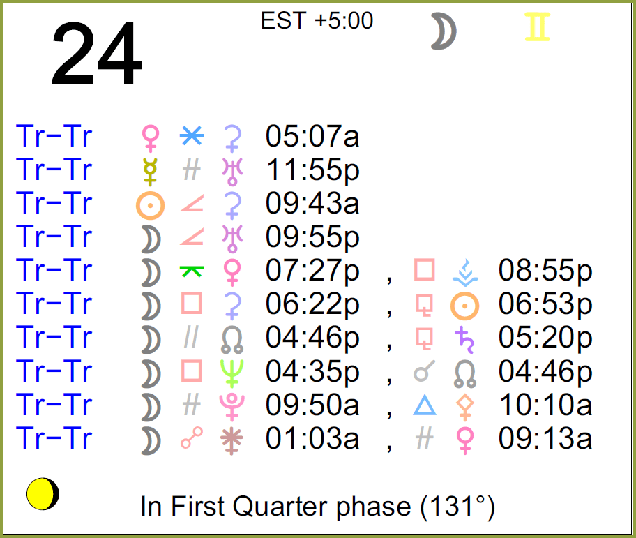 Planet Color Key: The longer the bar, the slower the aspecting planet, and the longer the duration of the planet’s transit.