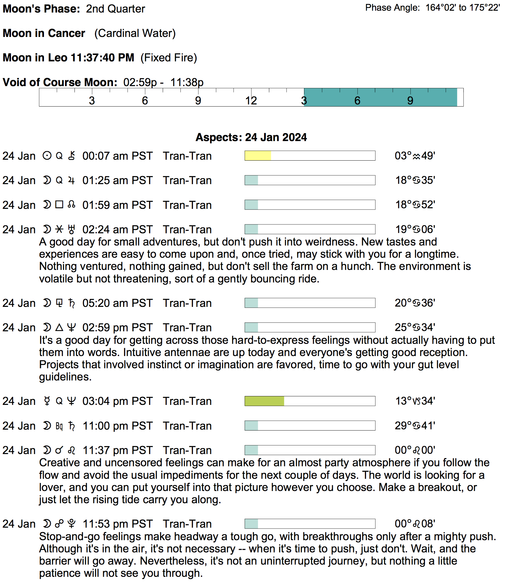 Planet Color Key: The longer the bar, the slower the aspecting planet, and the longer the duration of the planet’s transit.