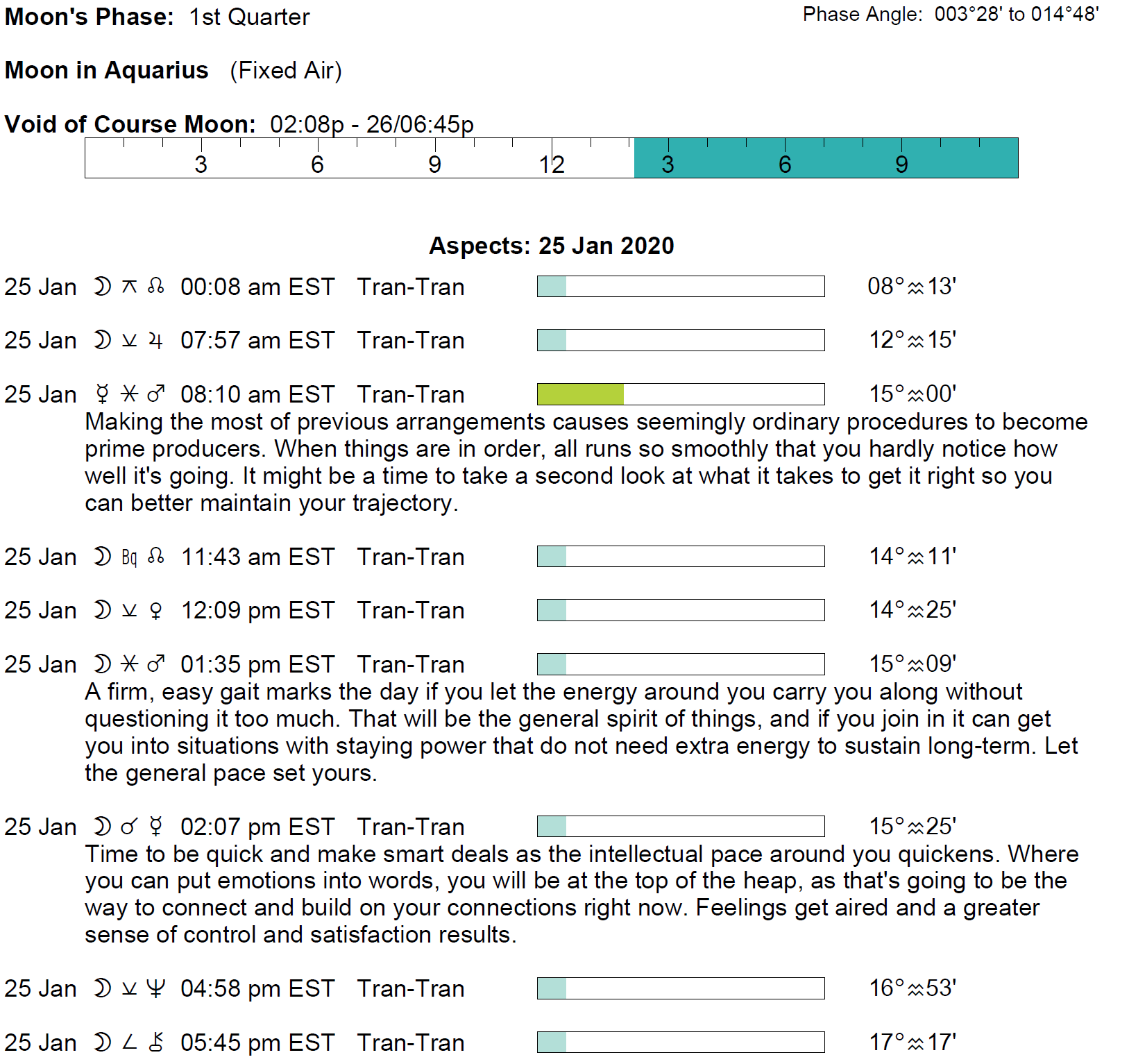Planet Color Key: The longer the bar, the slower the aspecting planet and the longer the duration of the planet’s transit.
