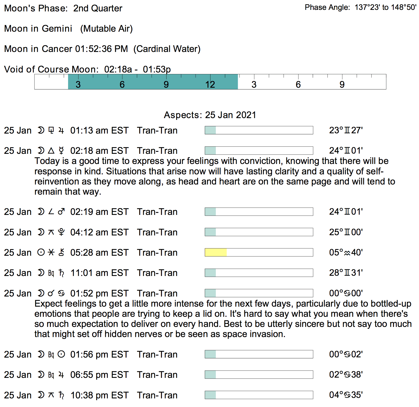 Planet Color Key: The longer the bar, the slower the aspecting planet, and the longer the duration of the planet’s transit.