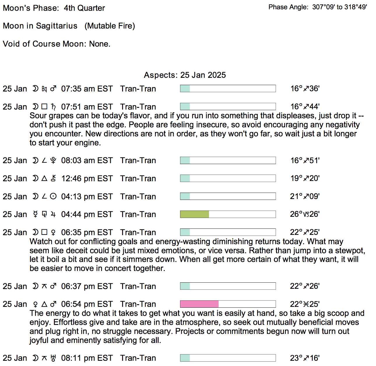 Planet Color Key: The longer the bar, the slower the aspecting planet, and the longer the duration of the planet’s transit.