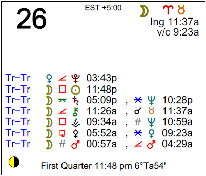 - The Moon is in its Waxing Crescent phase until 11:48 PM / First Quarter phase after 11:48 PM.