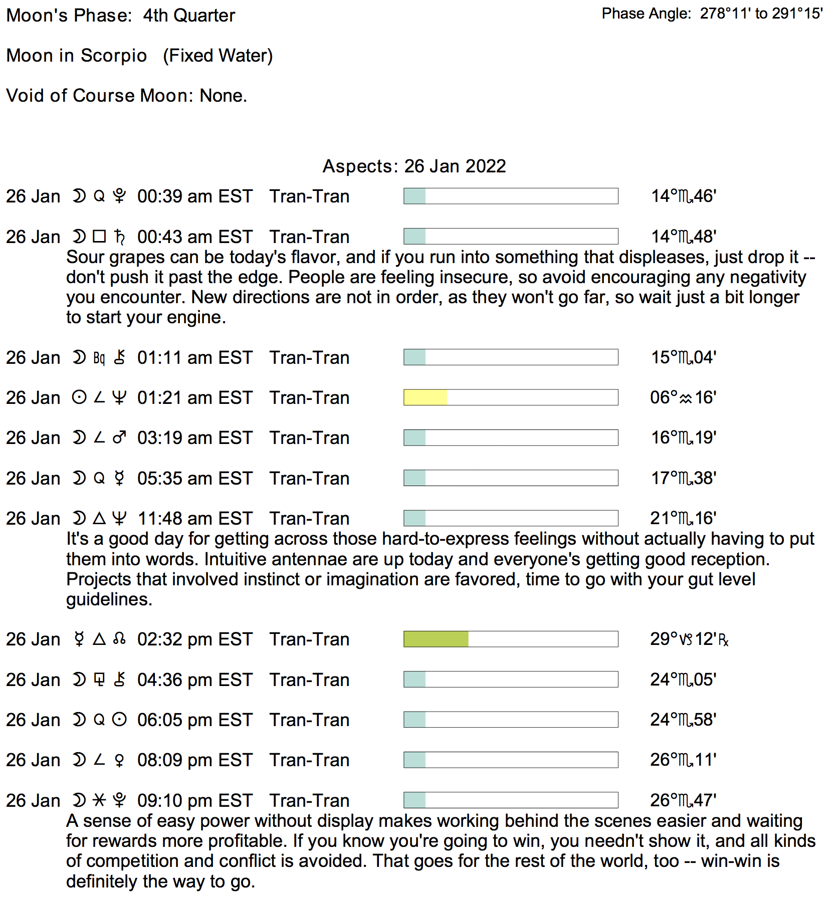 Planet Color Key: The longer the bar, the slower the aspecting planet, and the longer the duration of the planet’s transit.