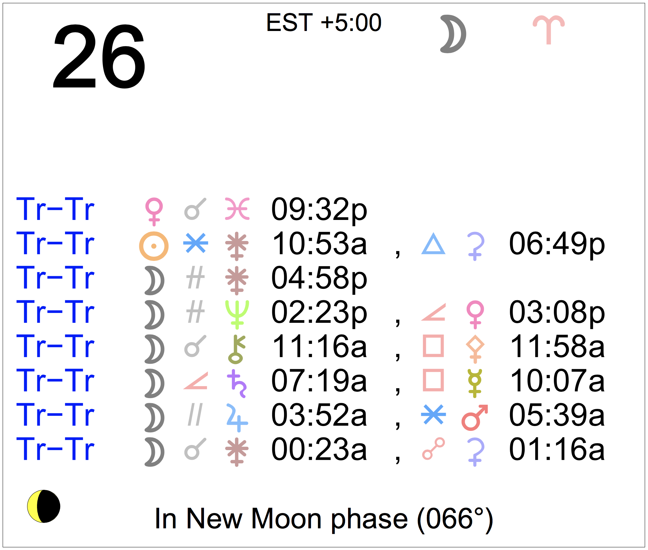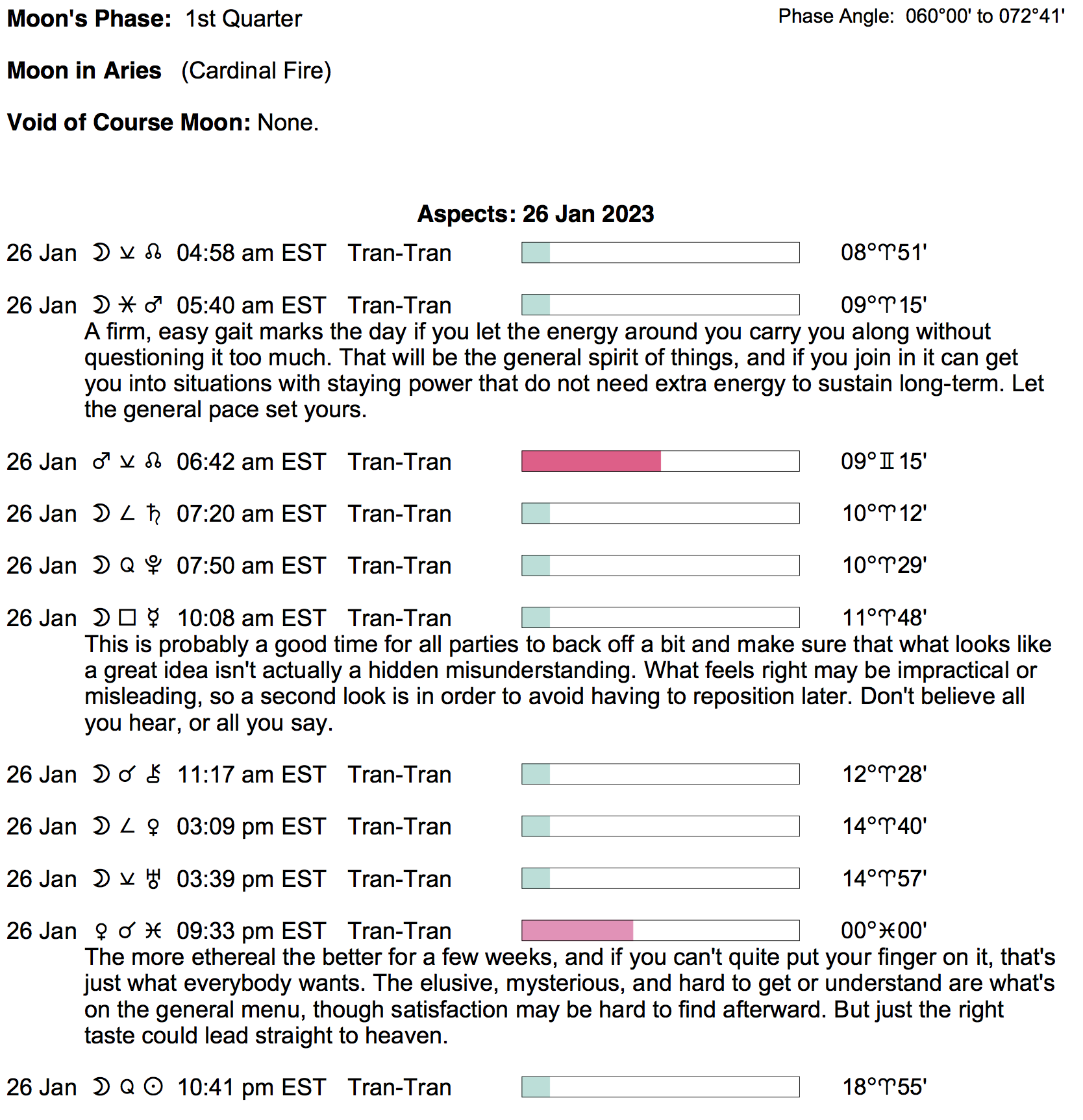 Planet Color Key: The longer the bar, the slower the aspecting planet, and the longer the duration of the planet’s transit.