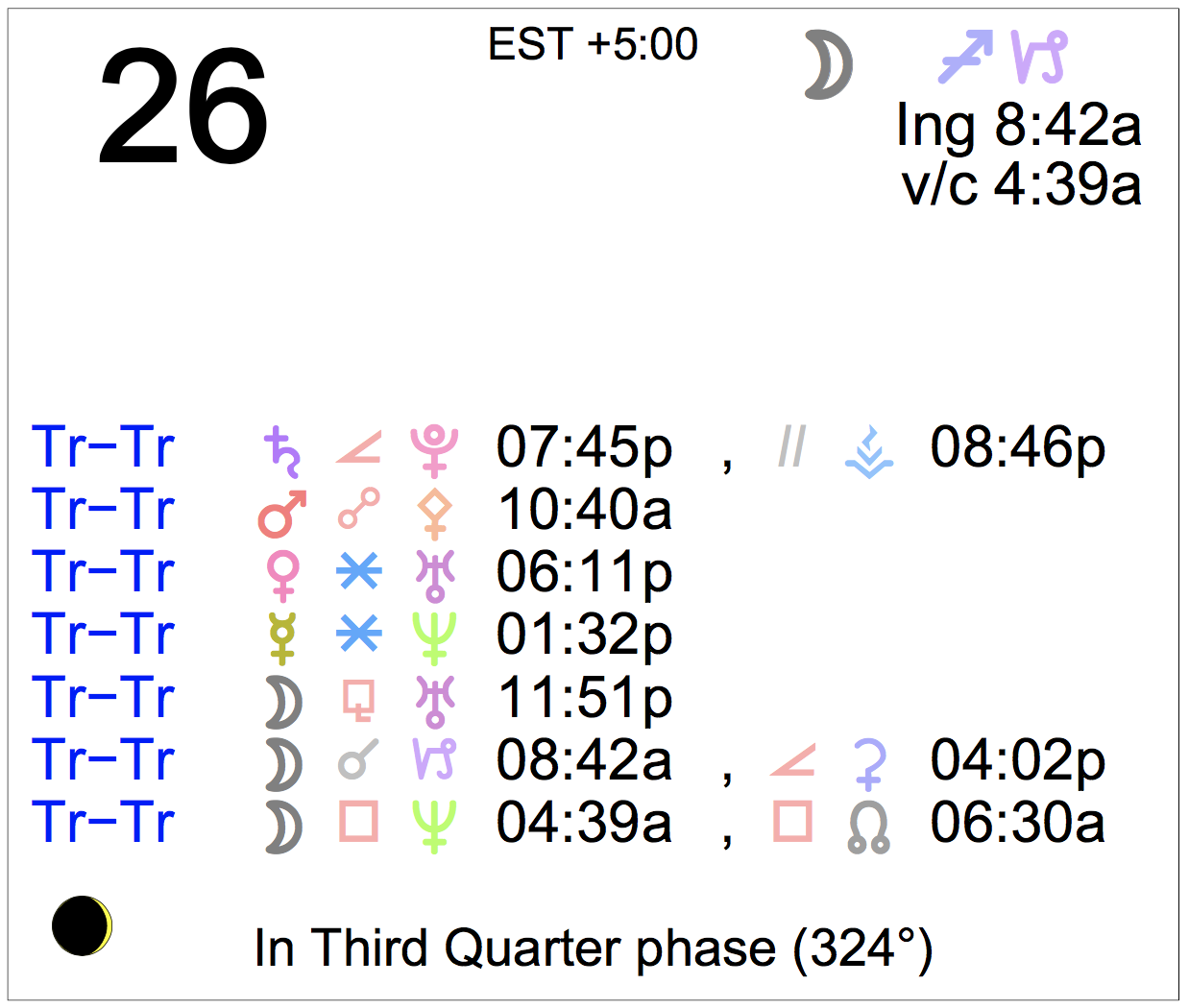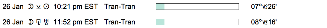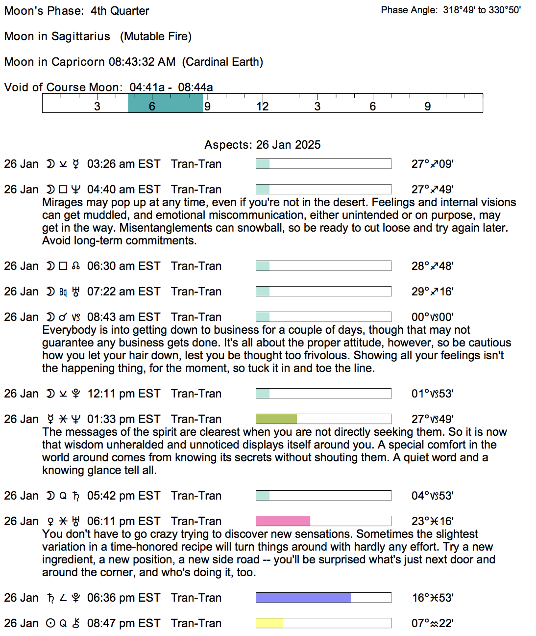 Planet Color Key: The longer the bar, the slower the aspecting planet, and the longer the duration of the planet’s transit.