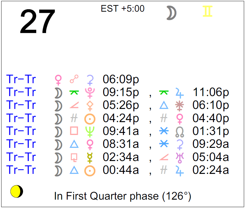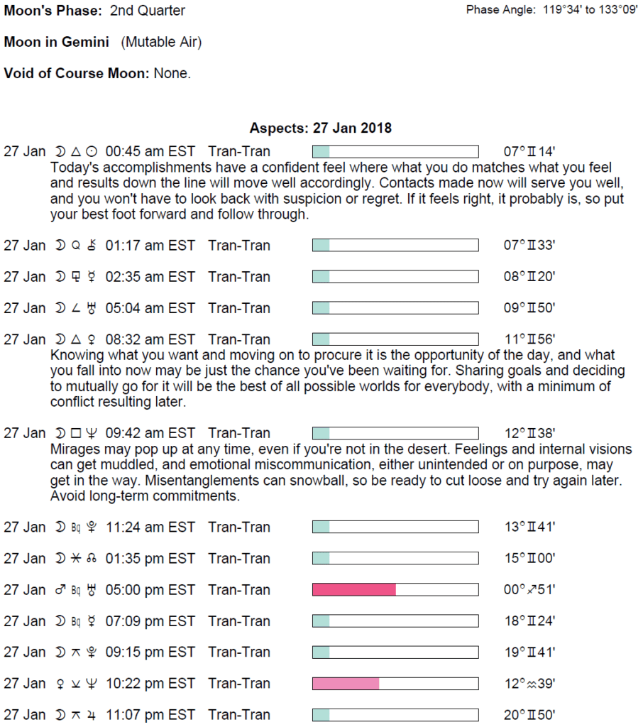 Planet Color Key: The longer the bar, the slower the aspecting planet and the longer the duration of the planet’s transit.