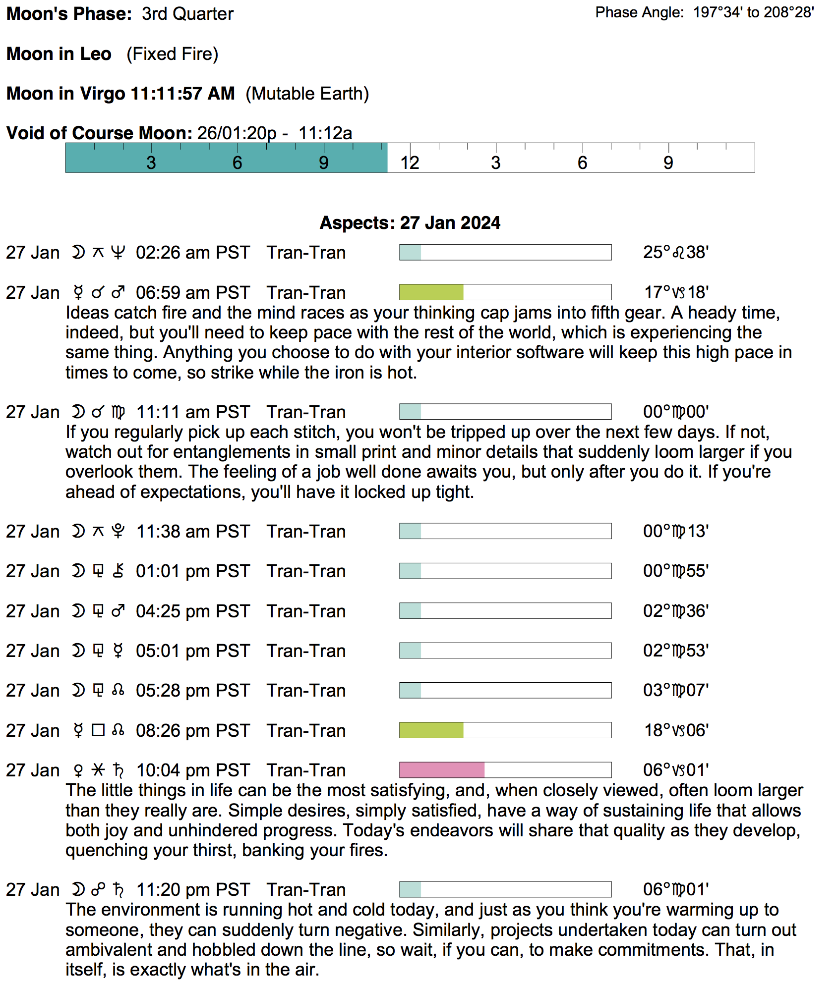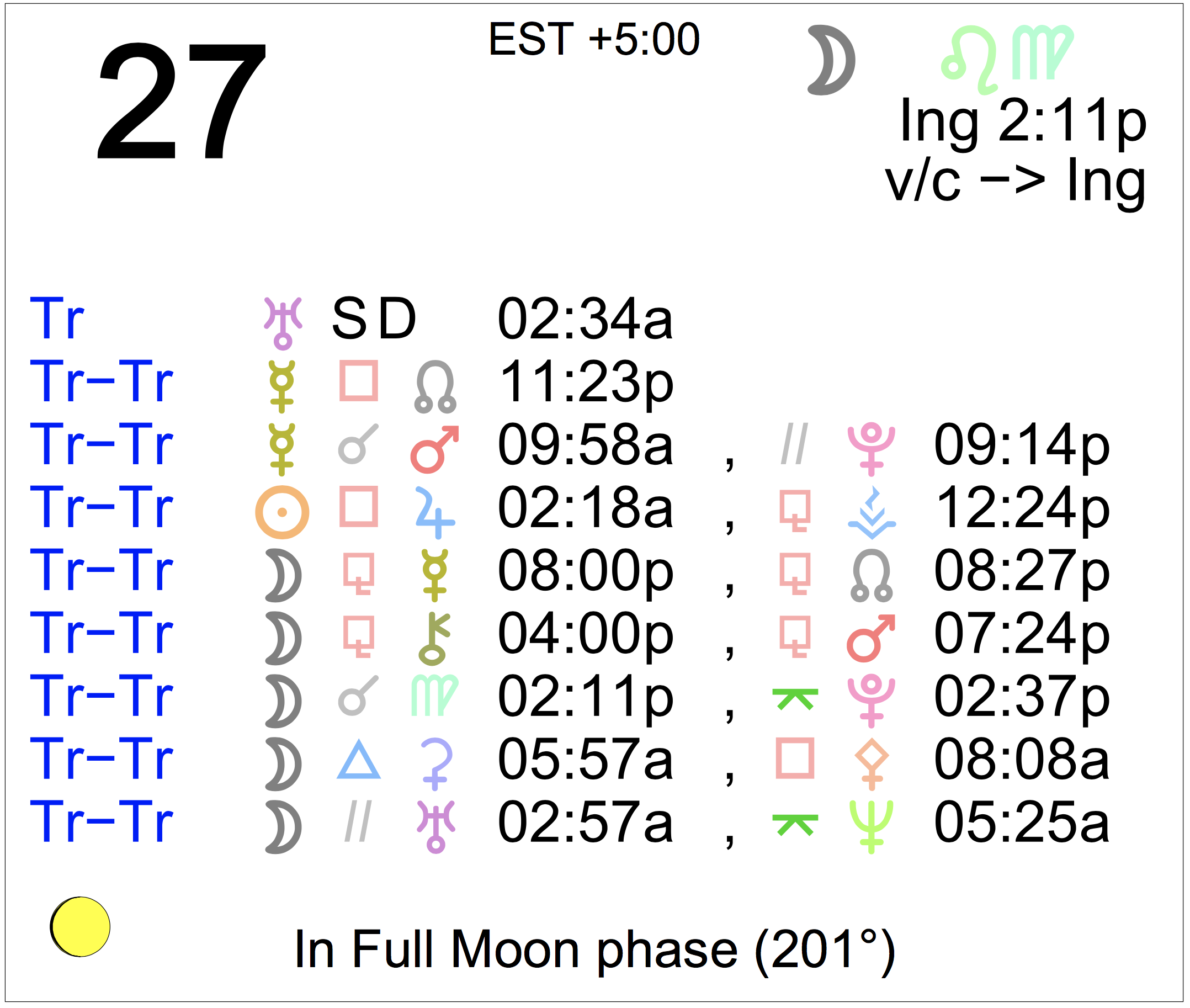 Planet Color Key: The longer the bar, the slower the aspecting planet, and the longer the duration of the planet’s transit.