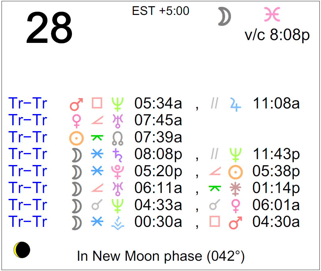 - The void Moon occurs from 8:08 PM forward (until tomorrow at 6:50 AM).