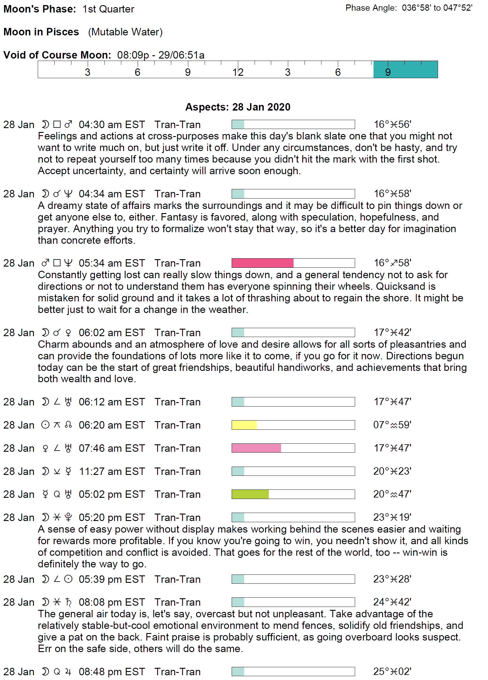 Planet Color Key: The longer the bar, the slower the aspecting planet and the longer the duration of the planet’s transit.