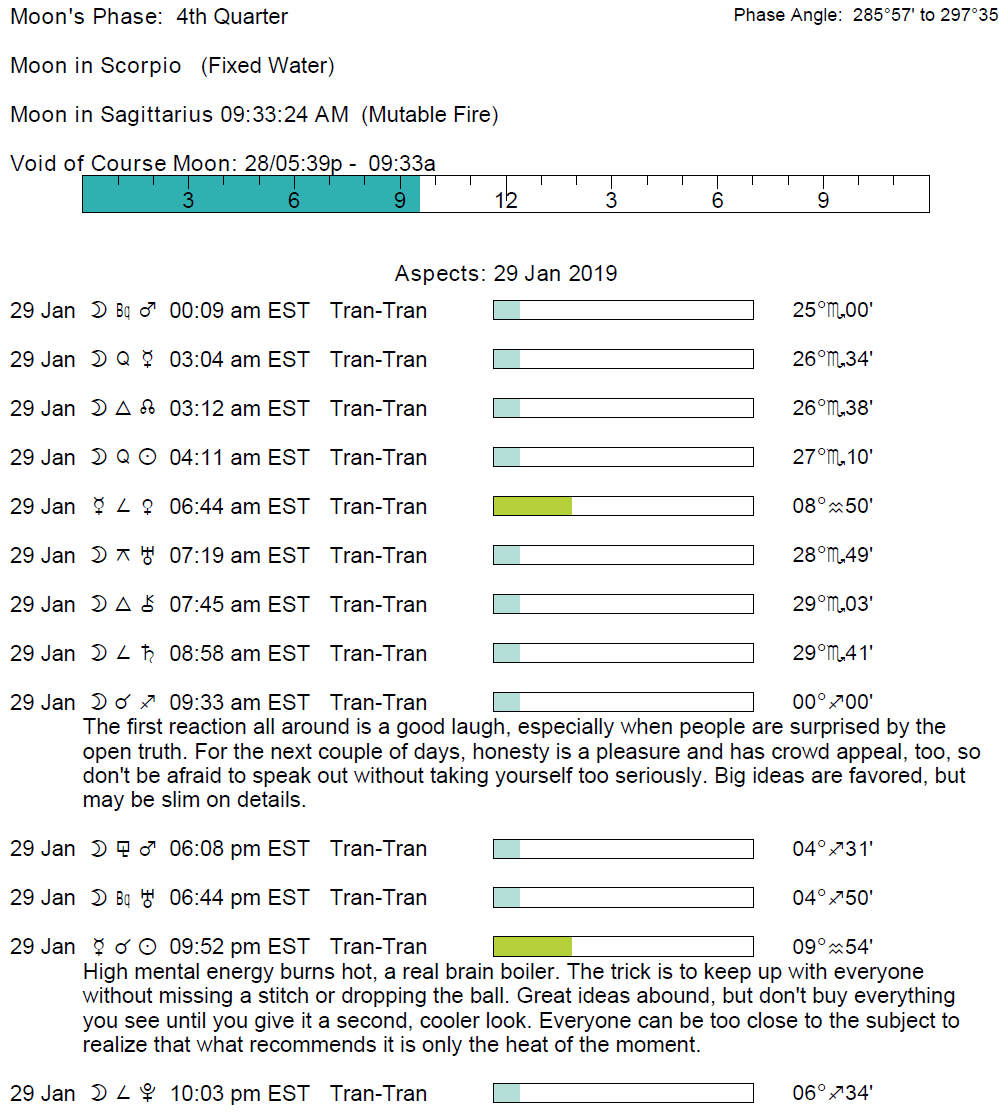 Planet Color Key: The longer the bar, the slower the aspecting planet and the longer the duration of the planet’s transit.