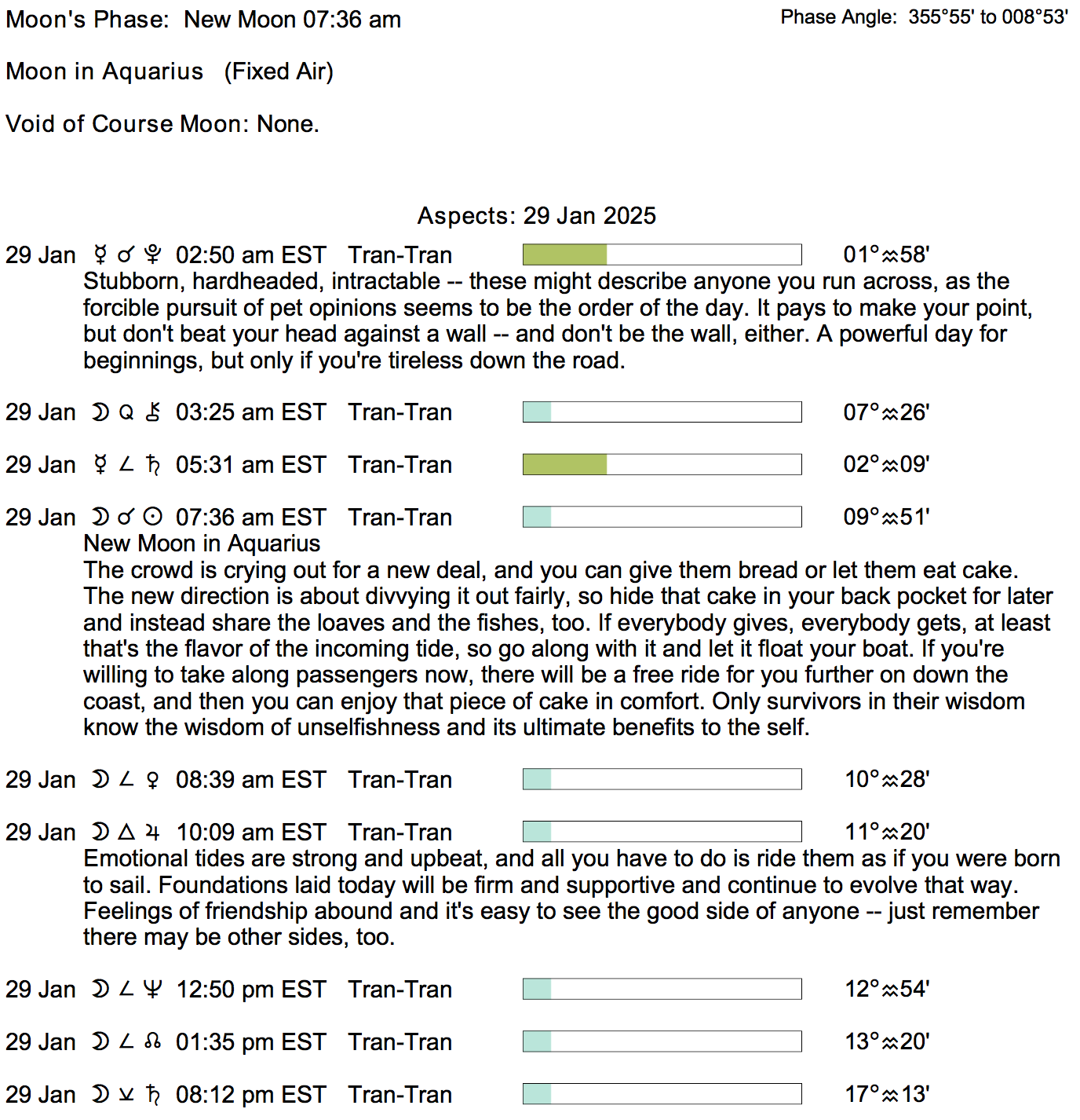 Planet Color Key: The longer the bar, the slower the aspecting planet, and the longer the duration of the planet’s transit.