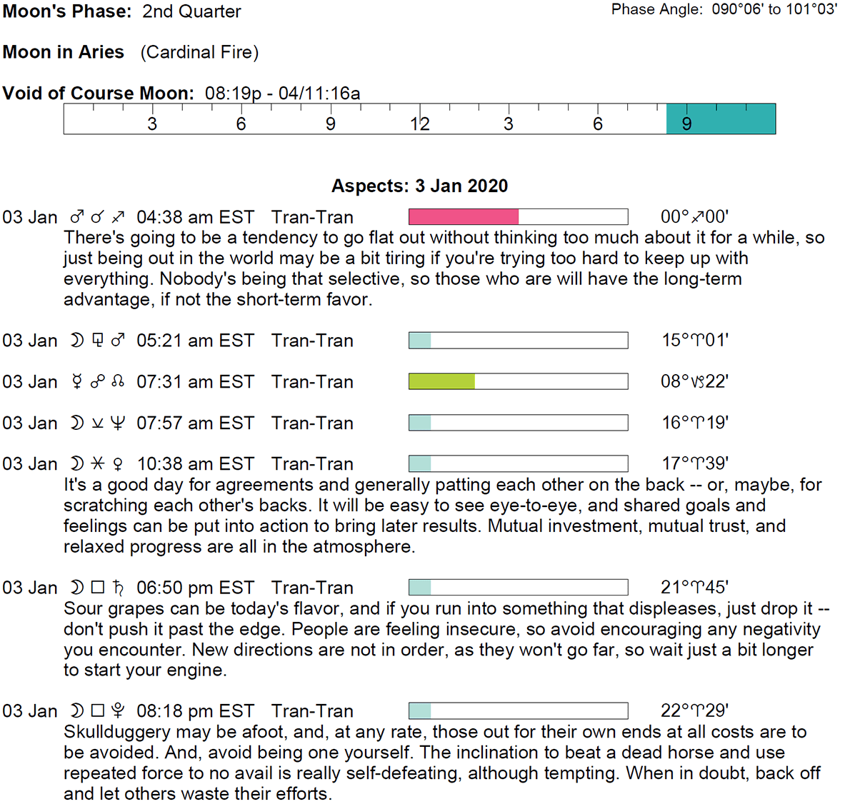 Planet Color Key: The longer the bar, the slower the aspecting planet and the longer the duration of the planet’s transit.