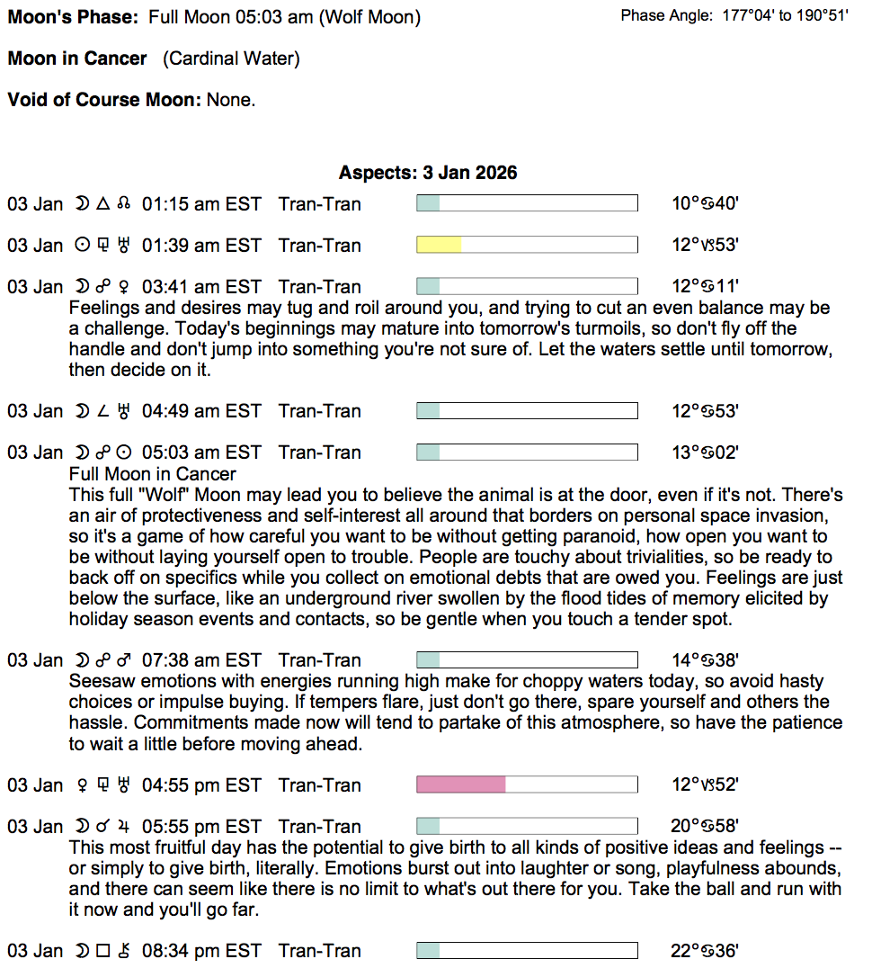 Planet Color Key: The longer the bar, the slower the aspecting planet, and the longer the duration of the planet’s transit.