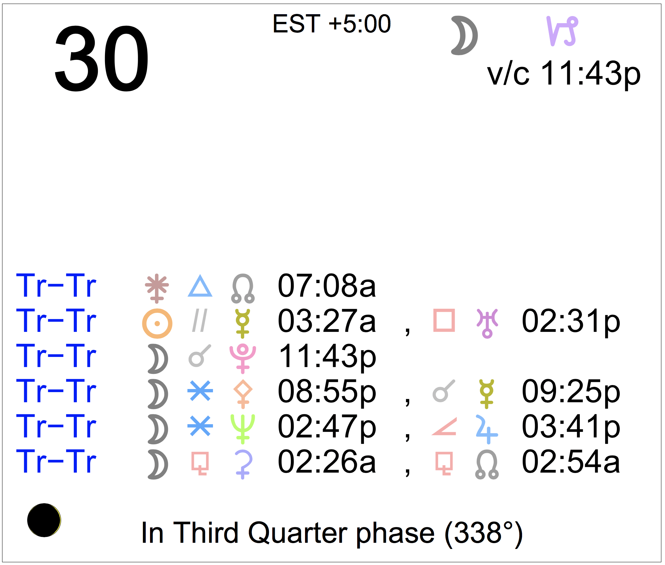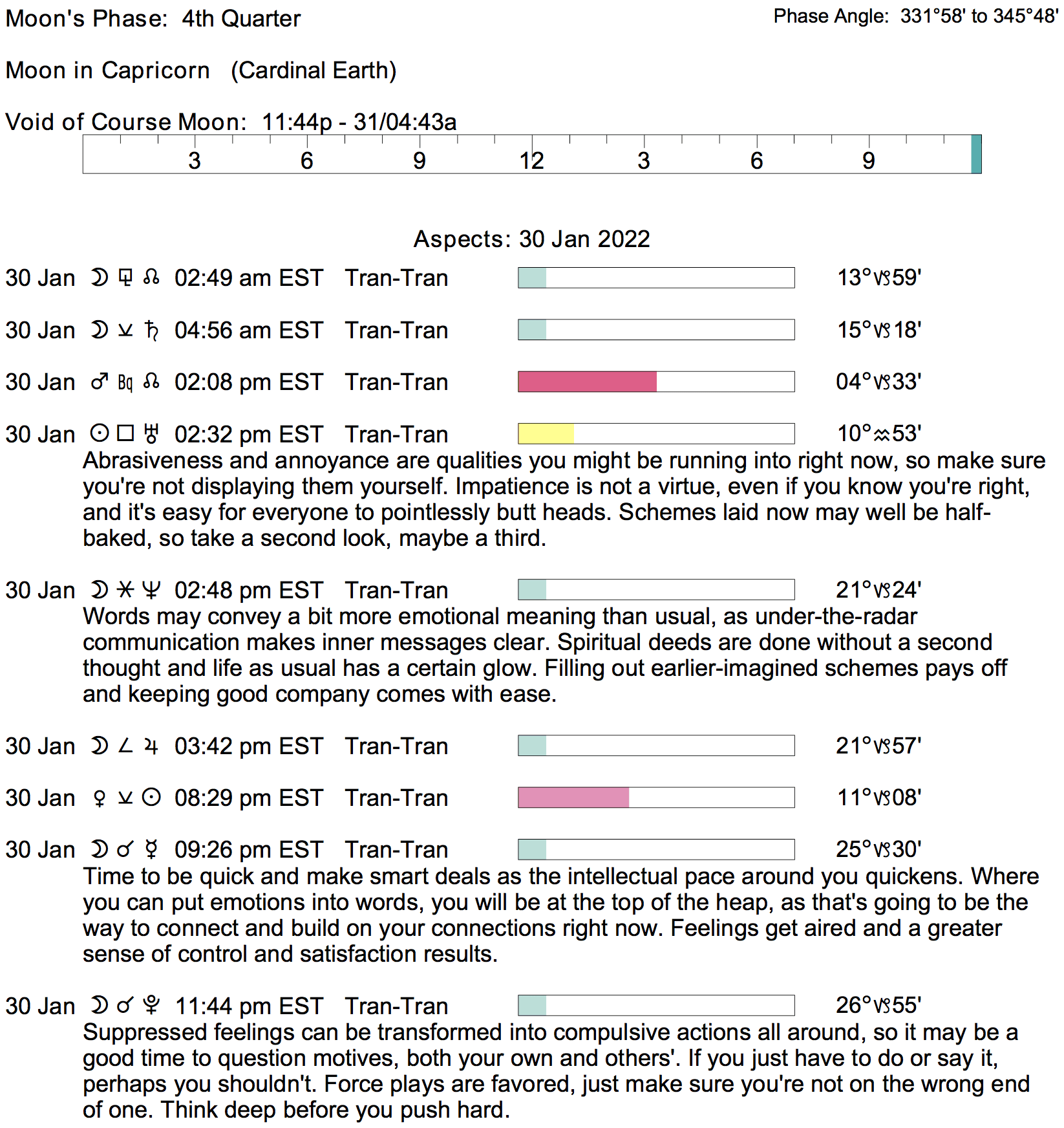 Planet Color Key: The longer the bar, the slower the aspecting planet, and the longer the duration of the planet’s transit.