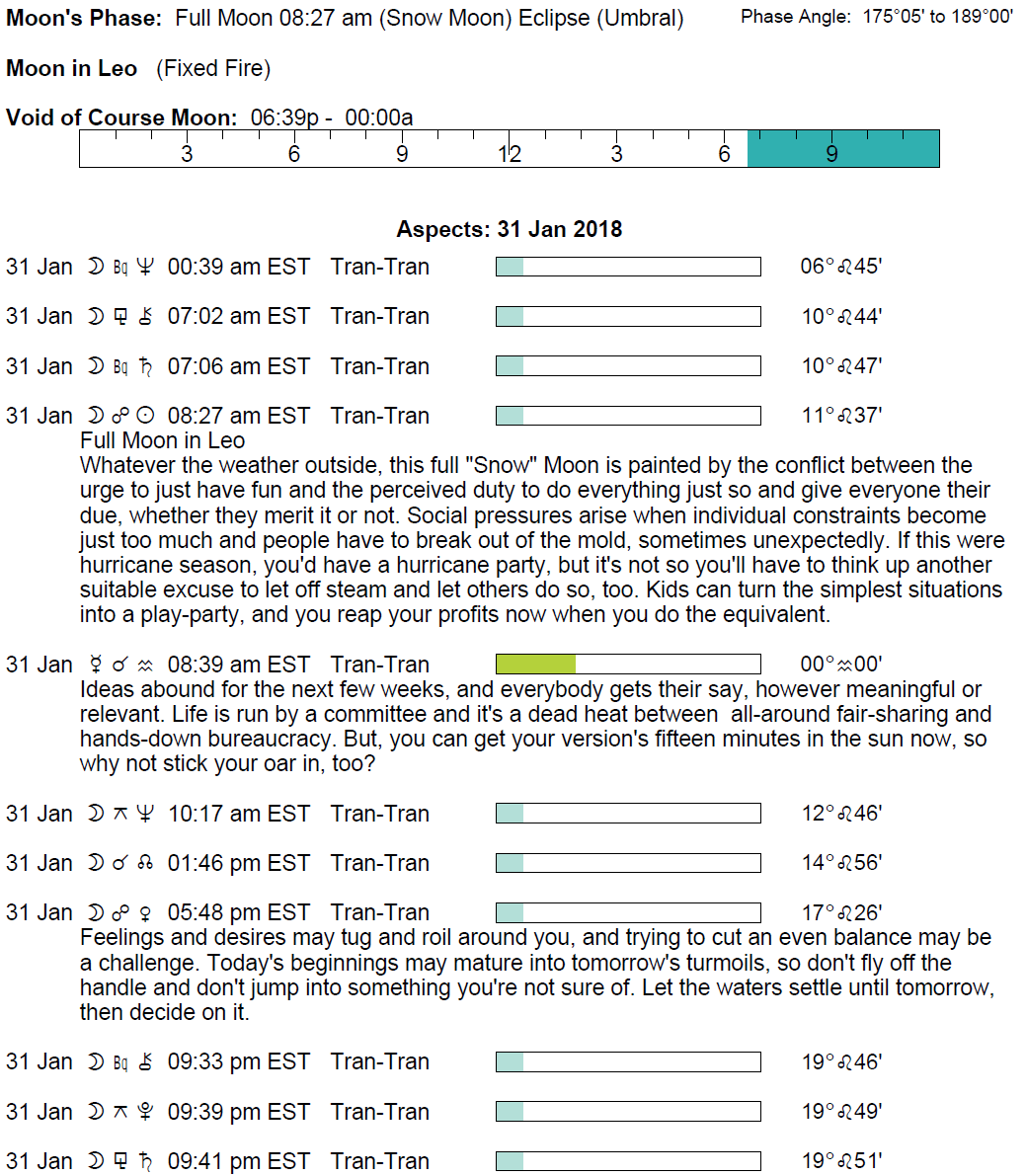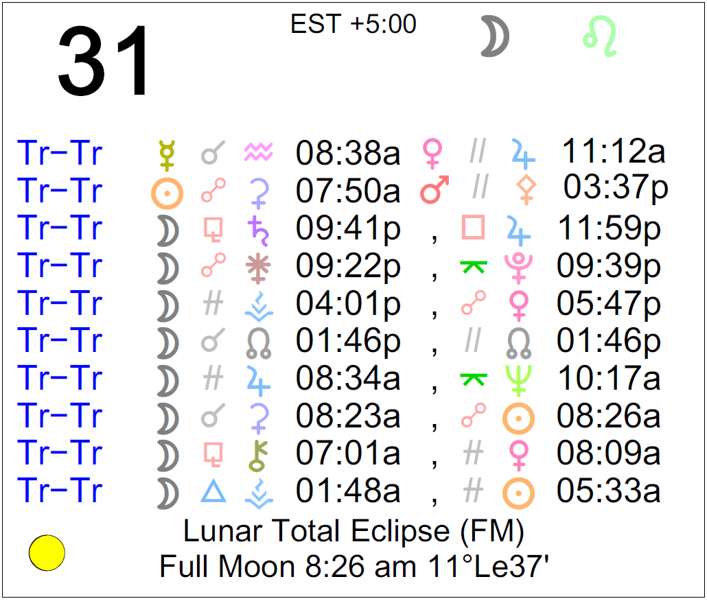 - The Full Moon/Lunar Eclipse occurs this morning at 8:26 AM in the sign of Leo.