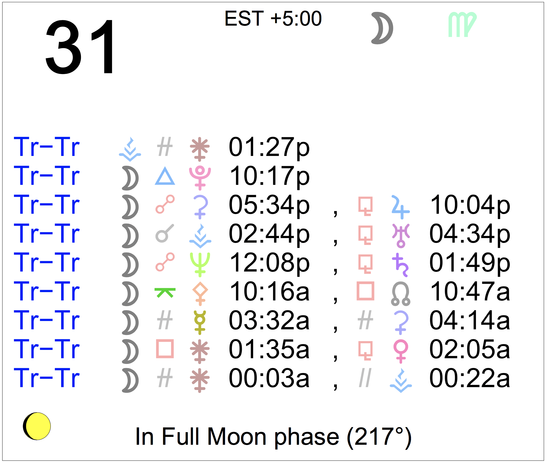 Planet Color Key: The longer the bar, the slower the aspecting planet, and the longer the duration of the planet’s transit.