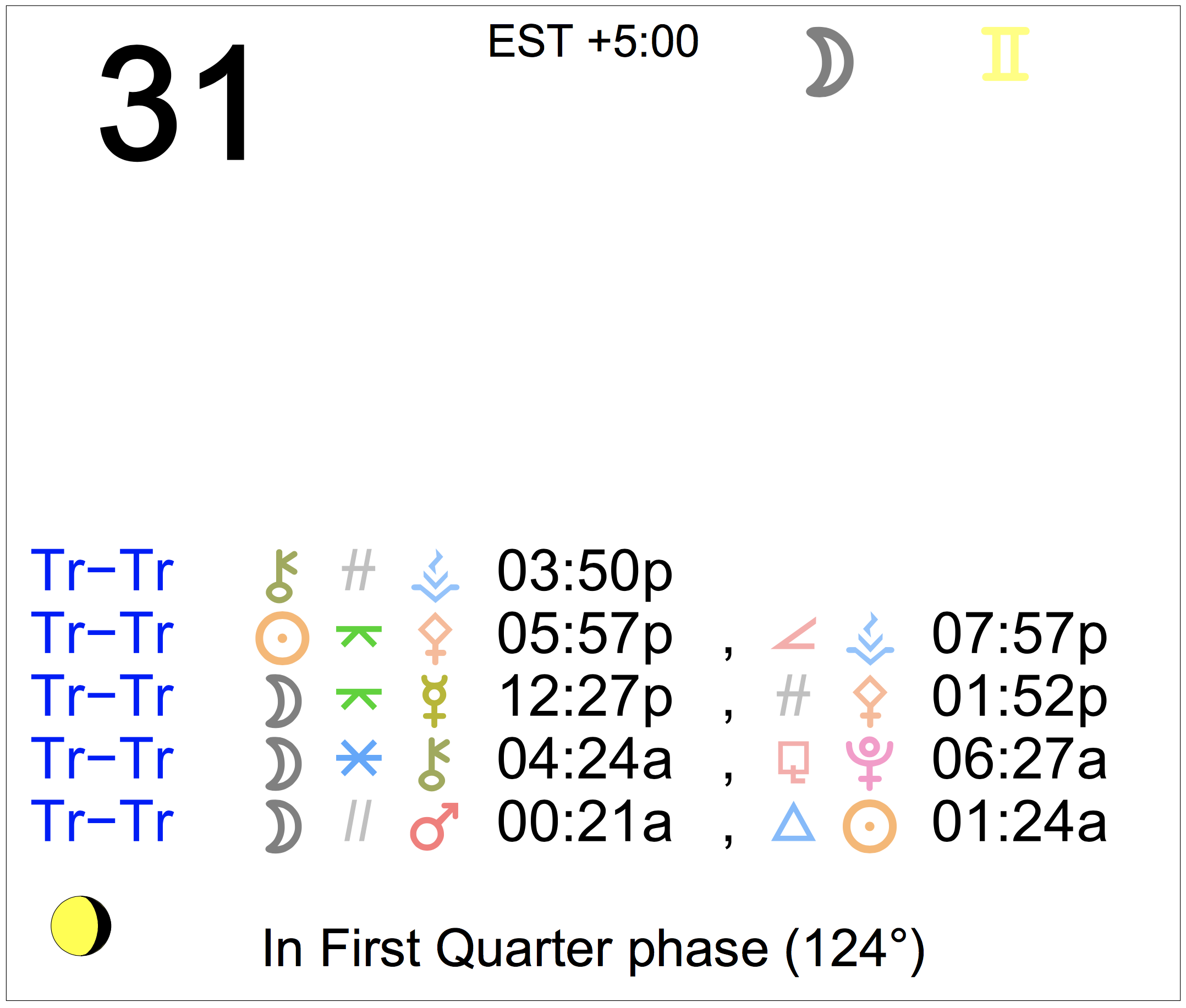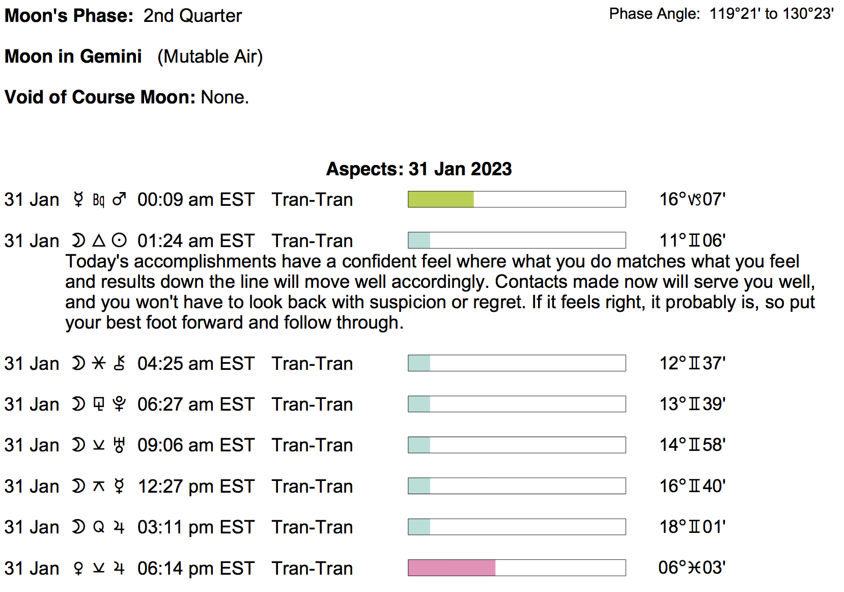 Planet Color Key: The longer the bar, the slower the aspecting planet, and the longer the duration of the planet’s transit.