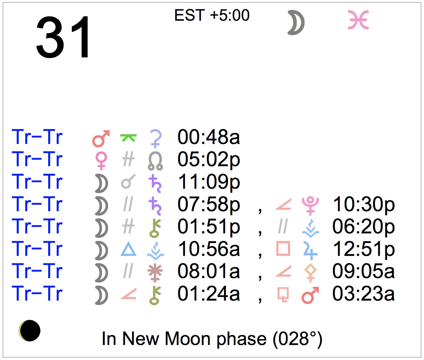 Planet Color Key: The longer the bar, the slower the aspecting planet, and the longer the duration of the planet’s transit.