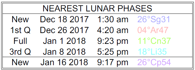 - The Full Moon occurred on the 1st in the sign of Cancer, and the Last Quarter Moon will occur on January 8th.