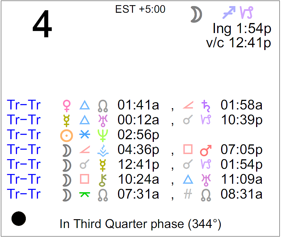 - The Moon is void from 12:41 PM to 1:54 PM.