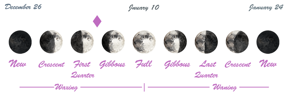 - The First Quarter Moon occurred on the 2nd, and the Full Moon/Lunar Eclipse will happen on January 10th.