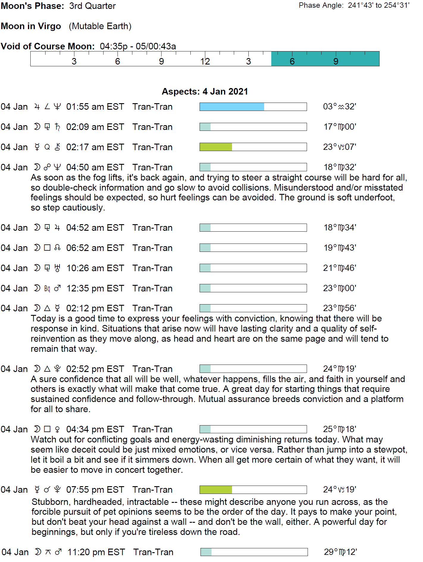 Planet Color Key: The longer the bar, the slower the aspecting planet, and the longer the duration of the planet’s transit.