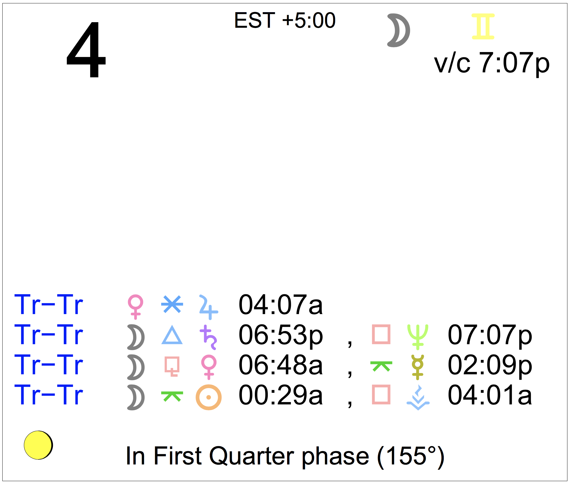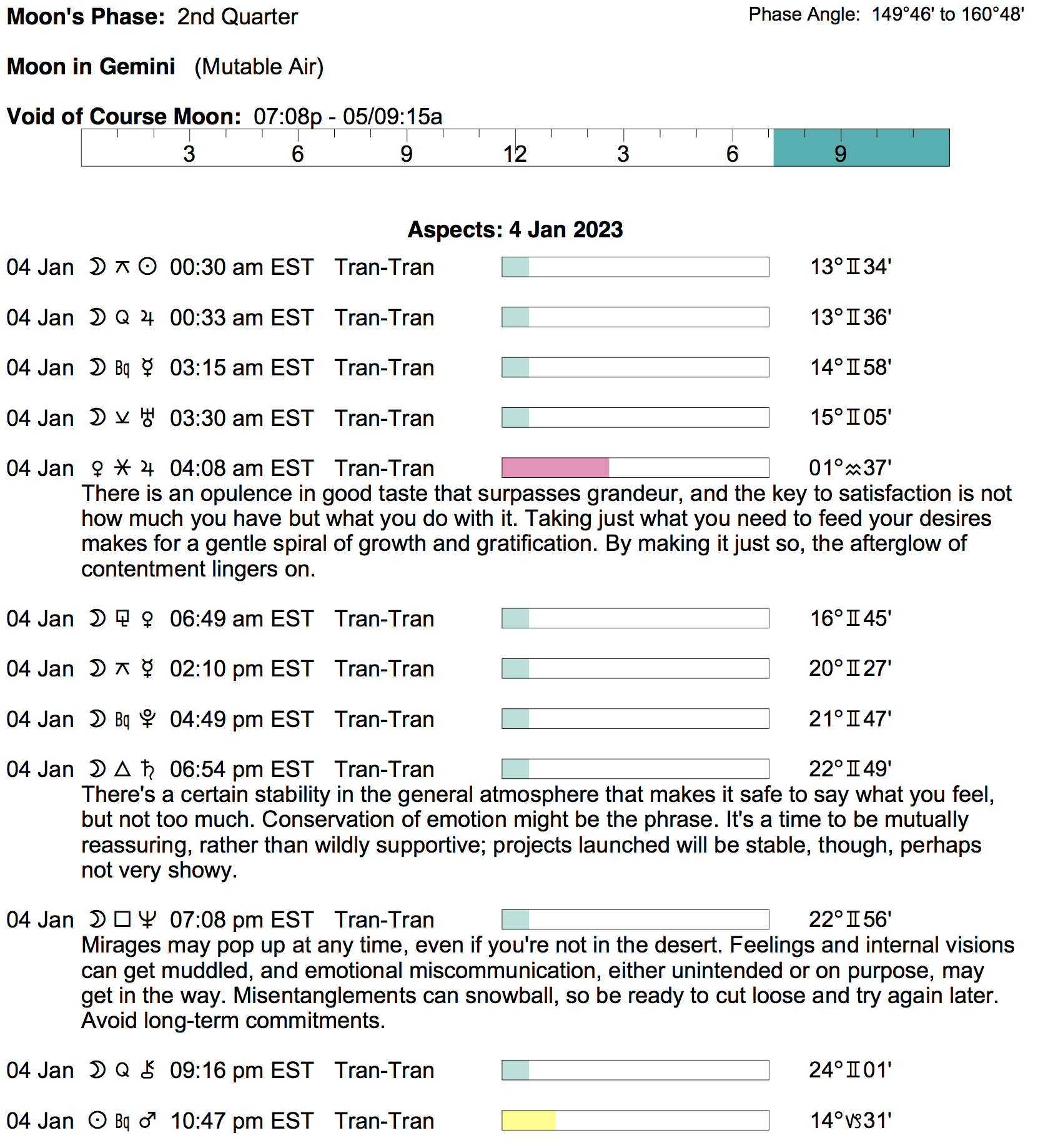 Planet Color Key: The longer the bar, the slower the aspecting planet, and the longer the duration of the planet’s transit.