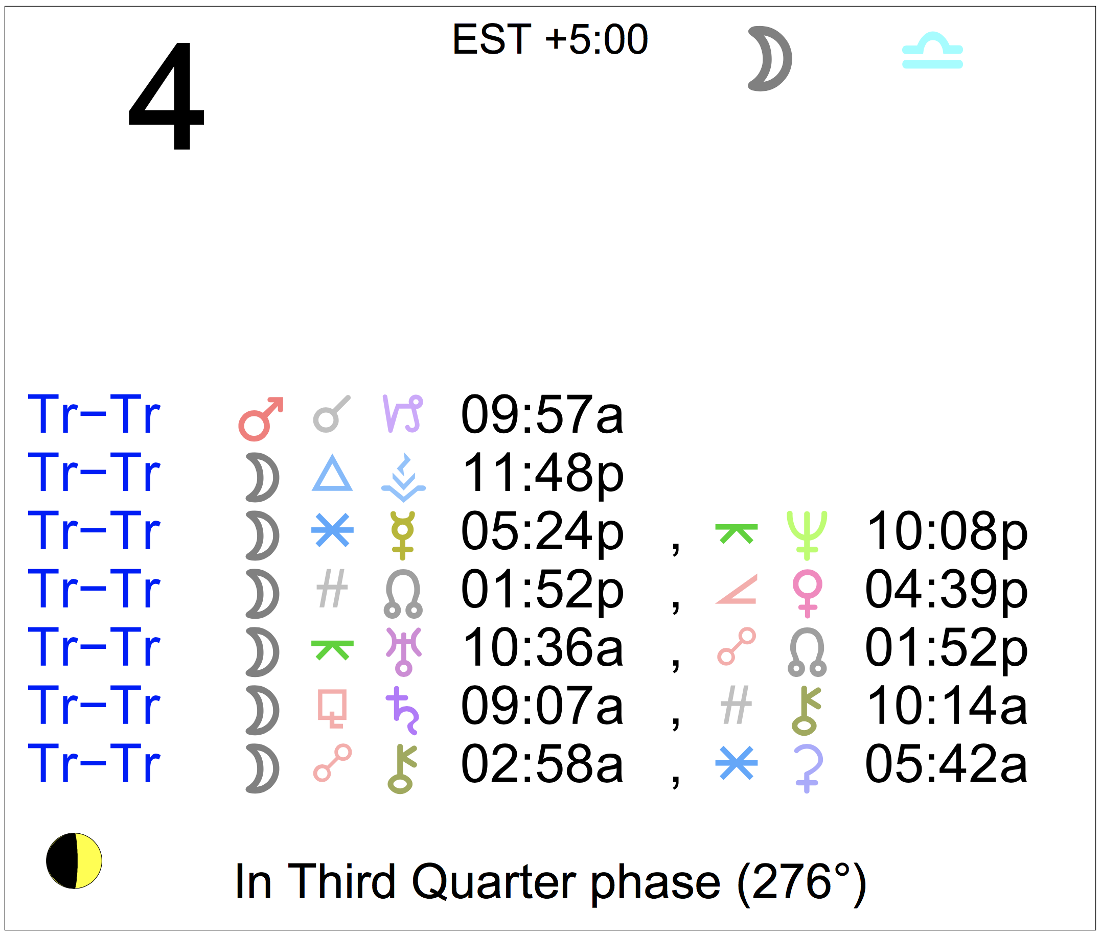 Planet Color Key: The longer the bar, the slower the aspecting planet, and the longer the duration of the planet’s transit.